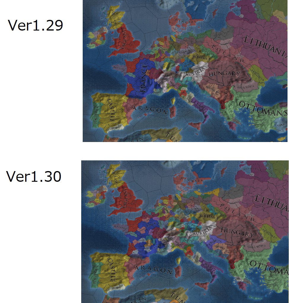 ここではGC開始時のFranceについてVer1.29とVer1.30のSSを比較し、主な新要素や変更点について分かる範囲で大まかに解説する