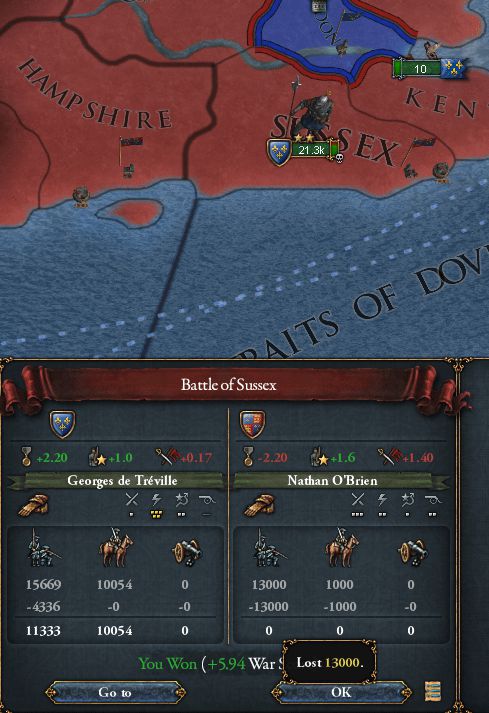 1477/02 開幕直後にEngland軍14k・Brittany軍4kを殲滅し、翌月には敵戦力が開戦前の3分の1(9k)になった