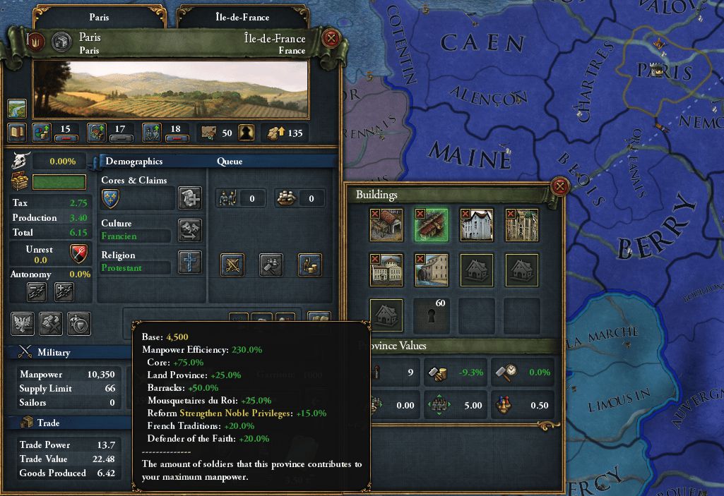 傭兵関係の割引もあるものの、前述のとおりここからは金銭面で困るはずもなく、はっきりいって空気だった これに限った話ではないが、WCを目指すような大拡張プレイ時の終盤はとにかく君主点が課題となると思う 必然的にコア化や外交併合など、君主点が絡む行動に対する割引が含まれる統治や影響の存在感は増す また別次元の問題として、(反乱を抑制することで)プレイヤー厭戦を防ぐ効果のある人文もより意義深いものとなるだろう 今回のプレイでは人文に加えて攻勢も取得したので、France国内で反乱が発生することがあまりなかった