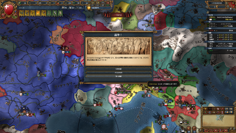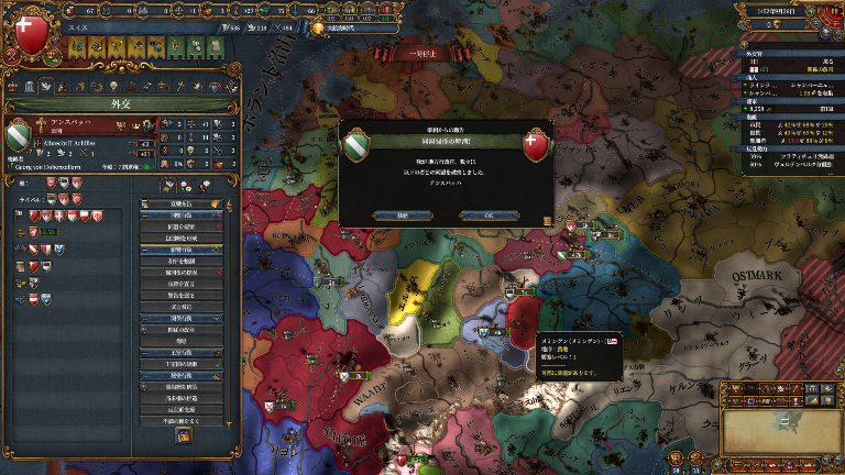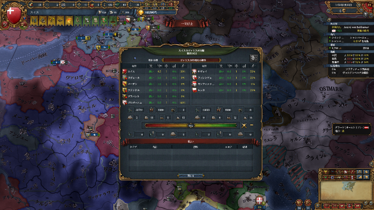 まあ味方にブルゴーニュと愉快な低地諸国がいる上アンスバッハも来るらしいのでスイスは占領しまくってればOK。