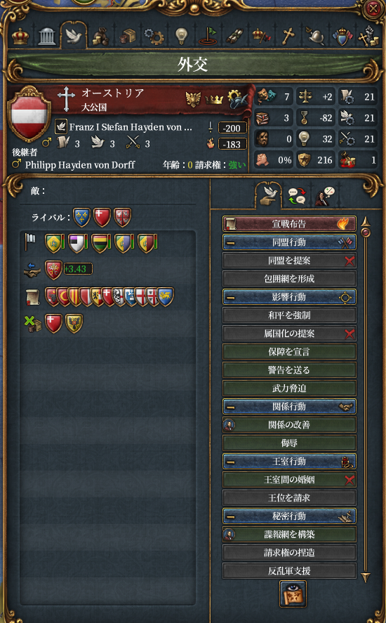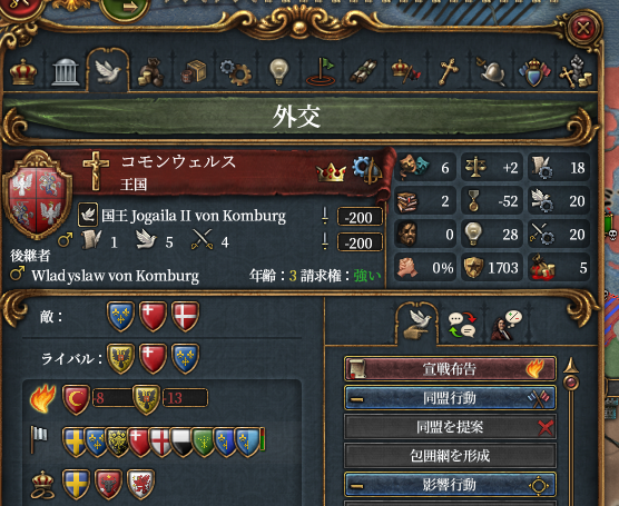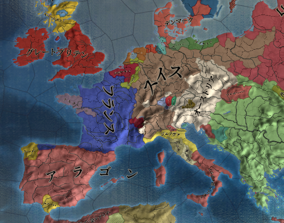 オーストリアの独立。どうやらアラゴンとの関係がこじれ君主が変わった瞬間に独立したようです。これにより中欧の大国オーストリアがバルトライン連合*3に加盟、さらに被宣戦リスクが上がります。