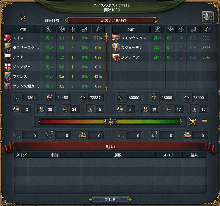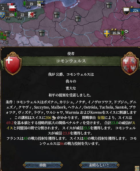 北ポーランドとバルト内陸をもらいました。羽馬がうまい。もう一度ポーランドを殴れば内陸99プロビ(実績の達成条件)に達しそうです。ちなみに現在82プロビです。