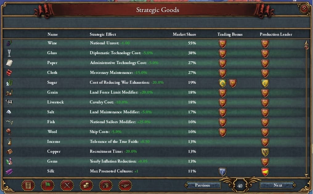 欧州を抑えたことで重要産出品のTrade Leaderになっています。Wine, Glass, Paper, Woolあたりが役に立っています。