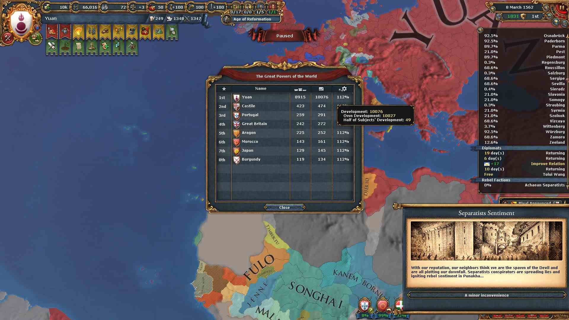 アフリカ以外の旧世界のほとんどを征服していますが、ここでようやく総開発度が10000を超えました。