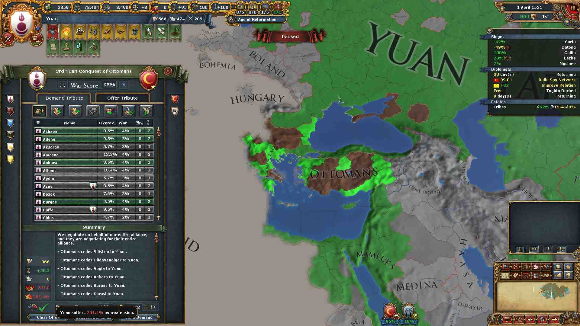 戦後の略奪により過剰拡大を下げることが出来ますが、多方面侵攻をしているのでこれ以降過剰拡大200%オーバーの状況が続いていきます。