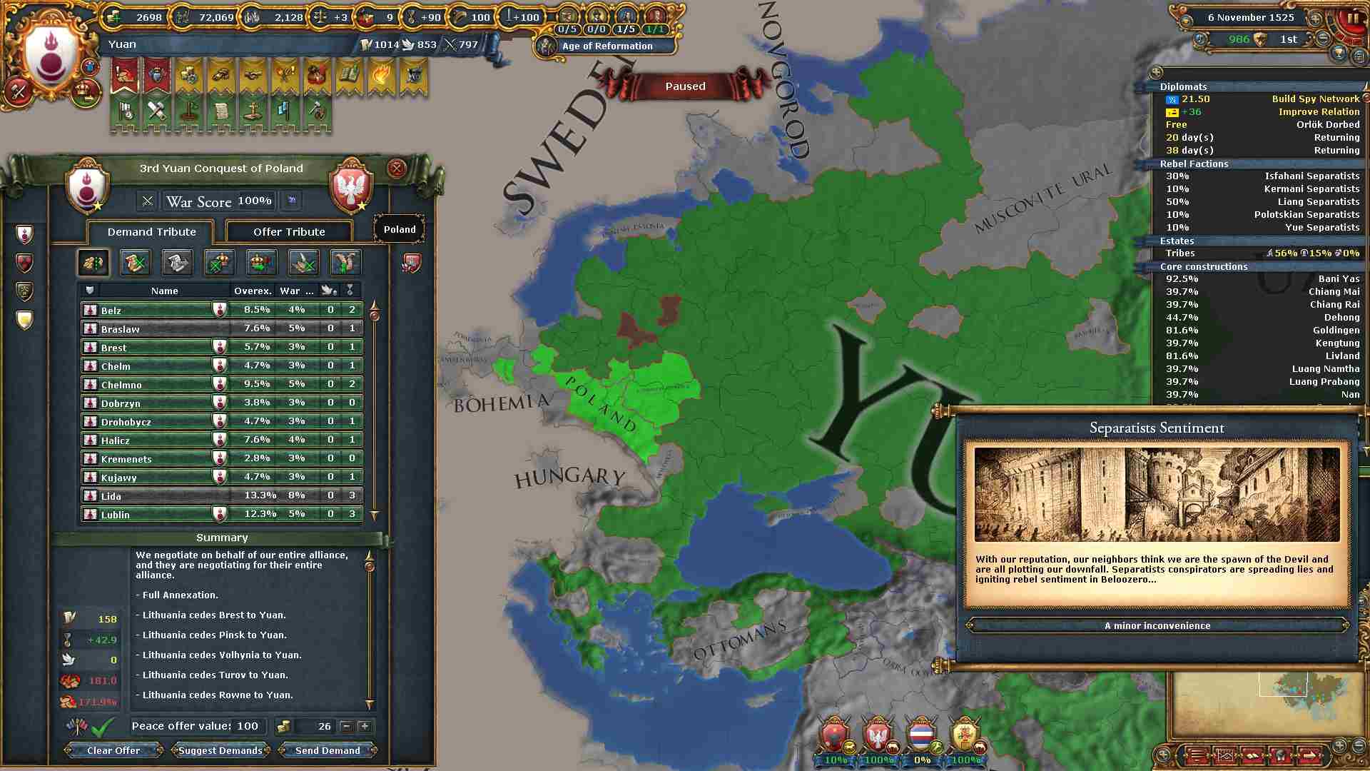チベット地域に侵攻した結果ミッション「チベットの併合」及び「信仰の保護」を一気に達成出来ました。