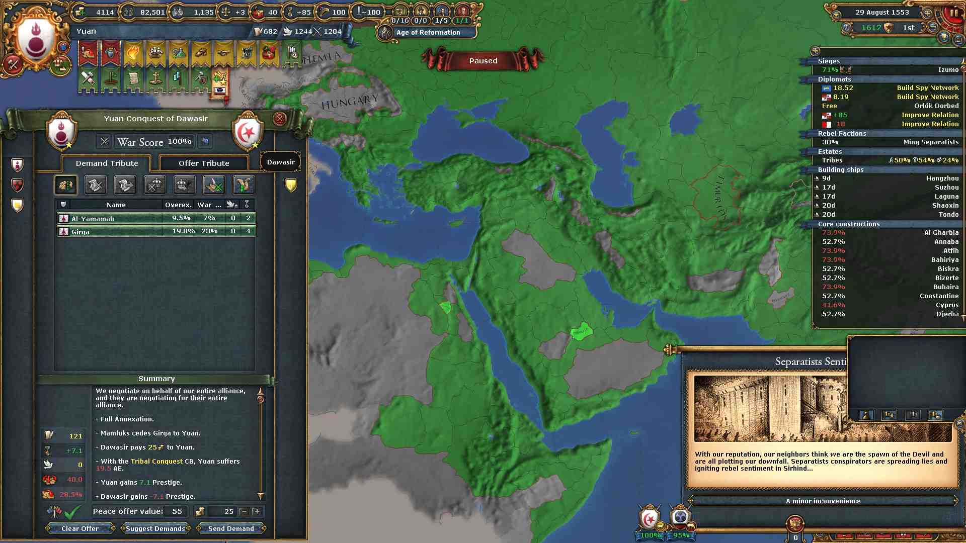 しかし汚職による不穏度減少効果により反乱も最小で済んでいます。