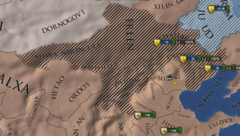 北京を占領されてしばらくすると反乱が「成功」してしまい、占領地域のAutonomyが上がるだけで終わってしまう。近郊に軍を待機しておいて、反乱軍占領後すぐに取り返せるように準備しておかなけれb
