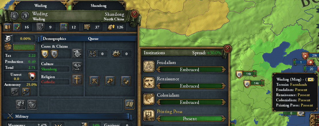 重要なのは立地じゃ。前回の青洲のように北方のプロビに反乱軍が発生すると、北京を目指したり北方を彷徨って大国に潰されてしまったりする。南海に近い広西および澳門から反乱軍が発生すれば高確率で儒教プロビを占領してくれるし、高プロビの江南地域がひっくり返るのも期待できるからの。