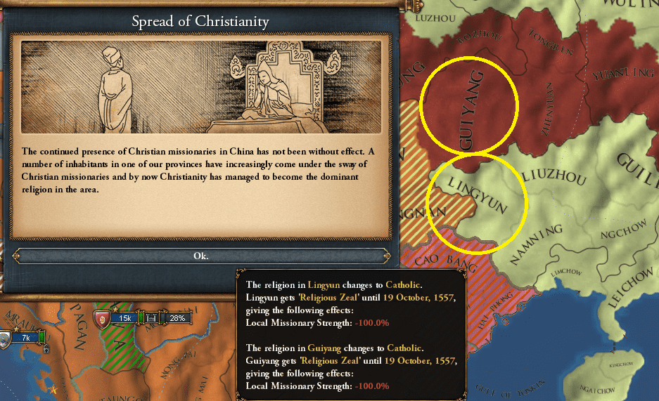 反乱進行度が40%以上になると、そのRebel Factionが活動しているプロビの反乱タイプは固定される。高Unrestの異教プロビに次々に宣教師を送り、反乱タイプをZealotに塗り替えることもできるんじゃ。