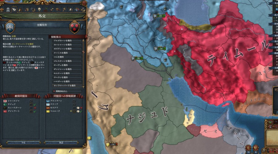 ギーラーン戦は1年を経ずに終息しました。我々は狙い通り2州を獲得。またティムールの好感14を得ました。