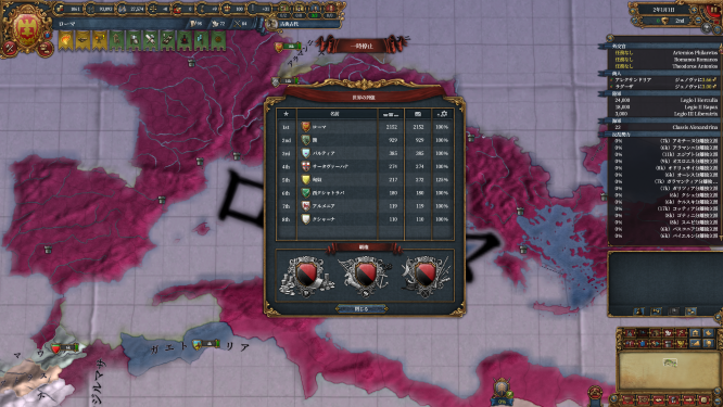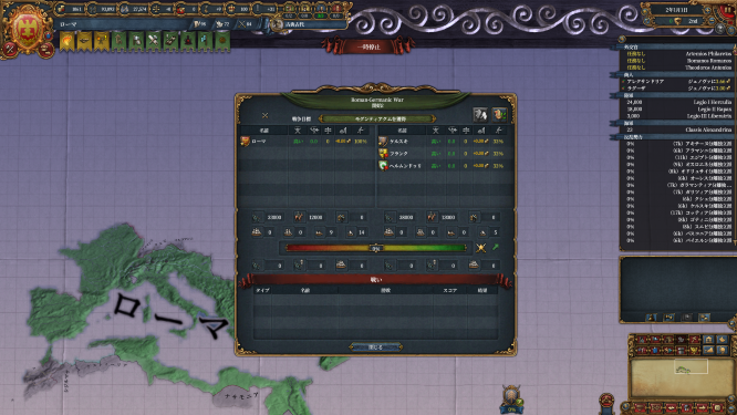 ローマは開始時点で戦争状態にあります。圧倒的な列強1位にも関わらずしょぼい戦力…