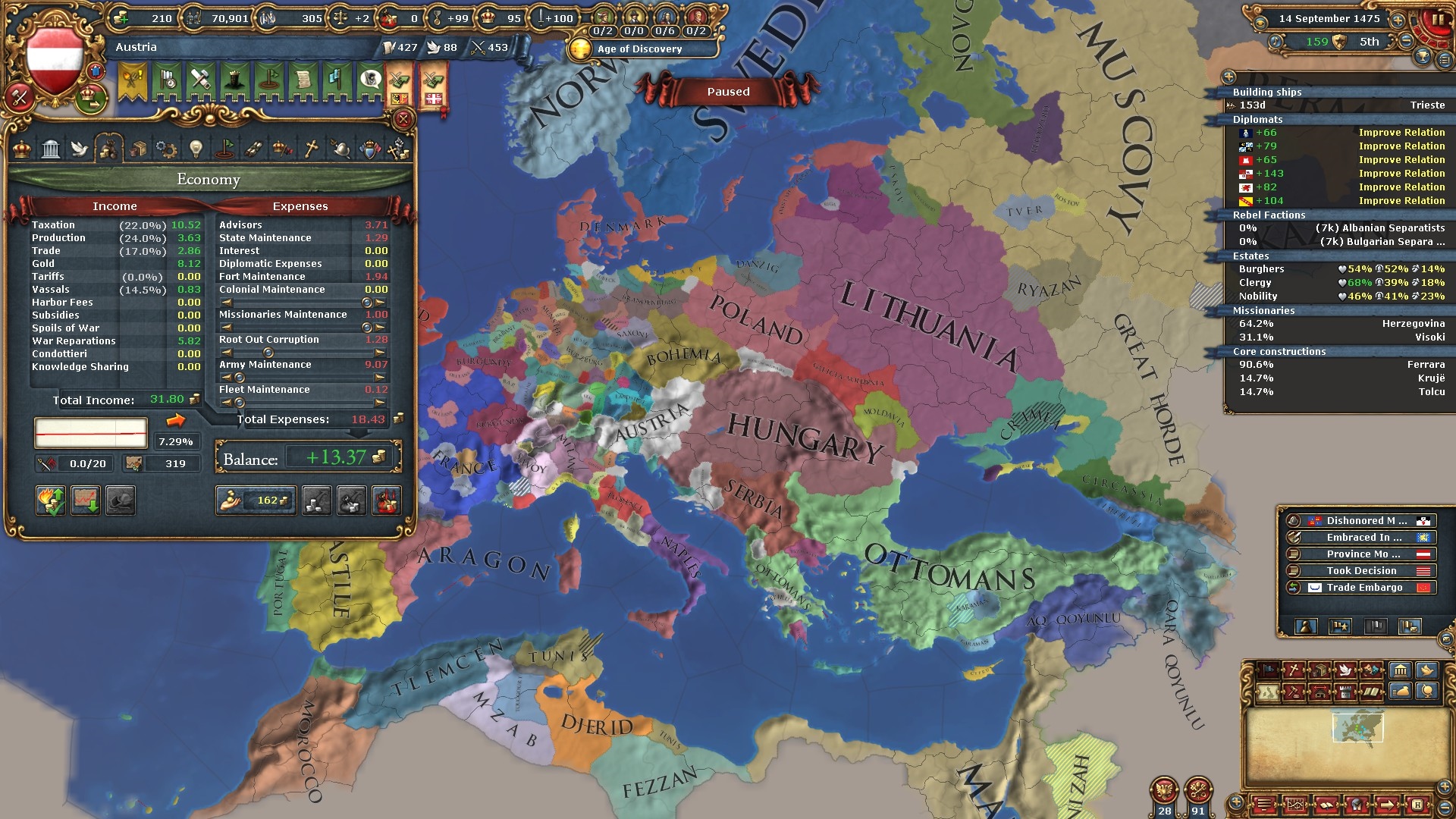 安定度1と引き換えに恒久的にアイデアコスト-5%と外交評判+1が得られます。破格の効果です。