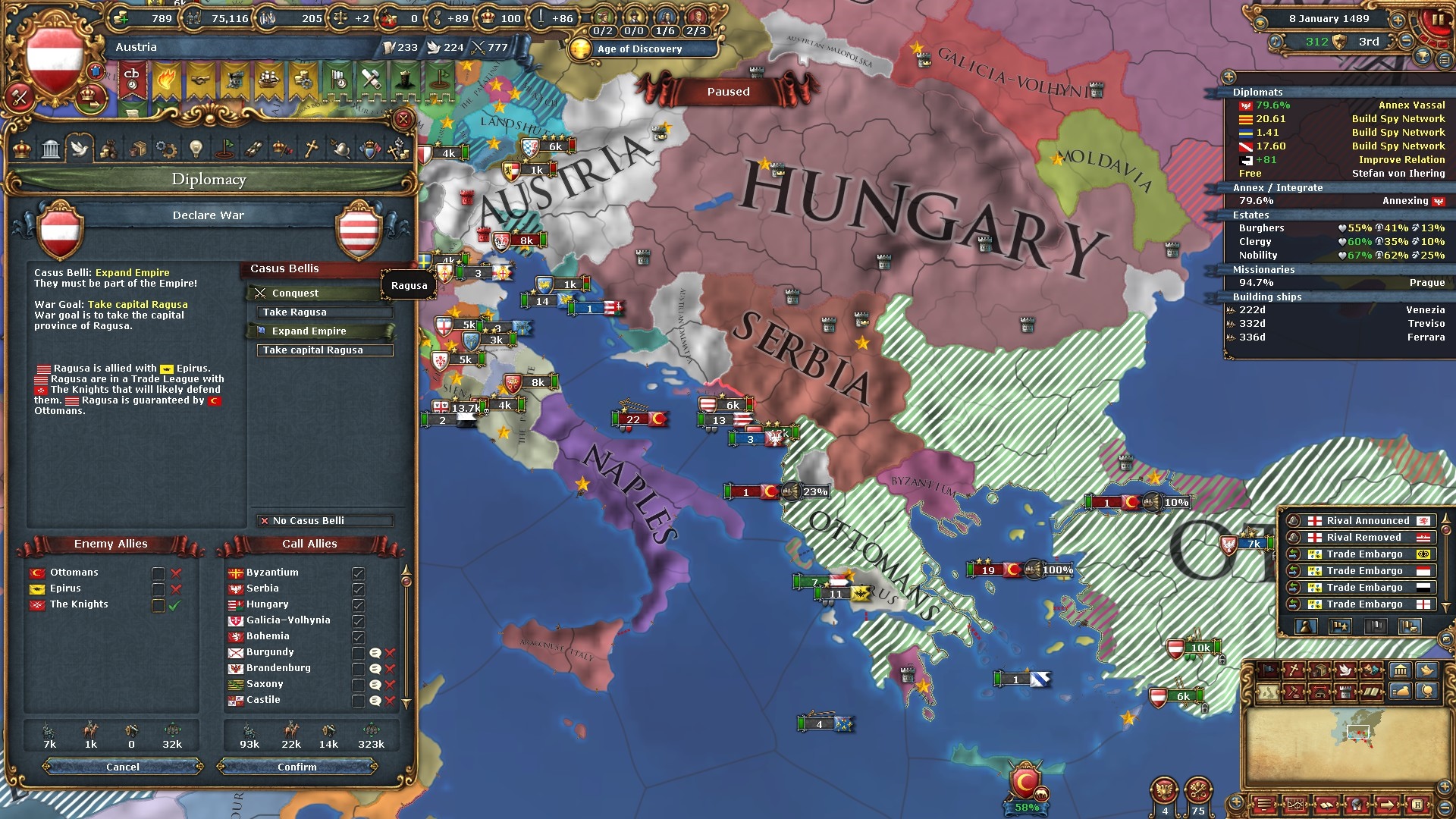 オスマン戦のどさくさに紛れて独立保障されているラグーザに帝国の拡大CBにて攻め込みます。