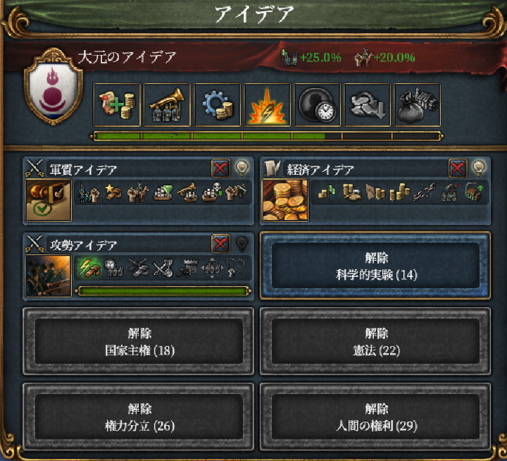 ポリシー込みで規律15、砲兵戦闘力20、その他戦闘補正盛りだくさんなアホな力を得られます