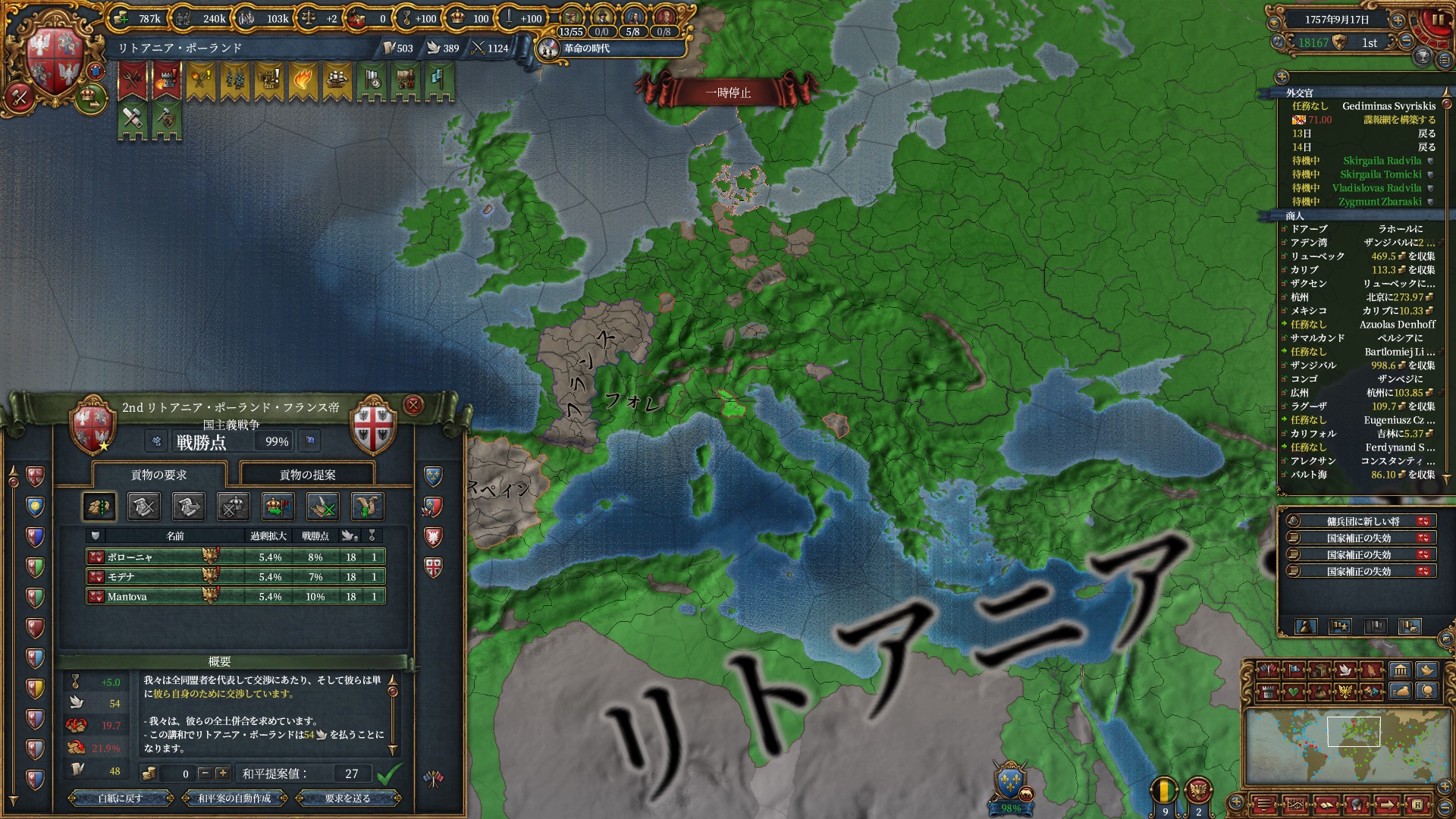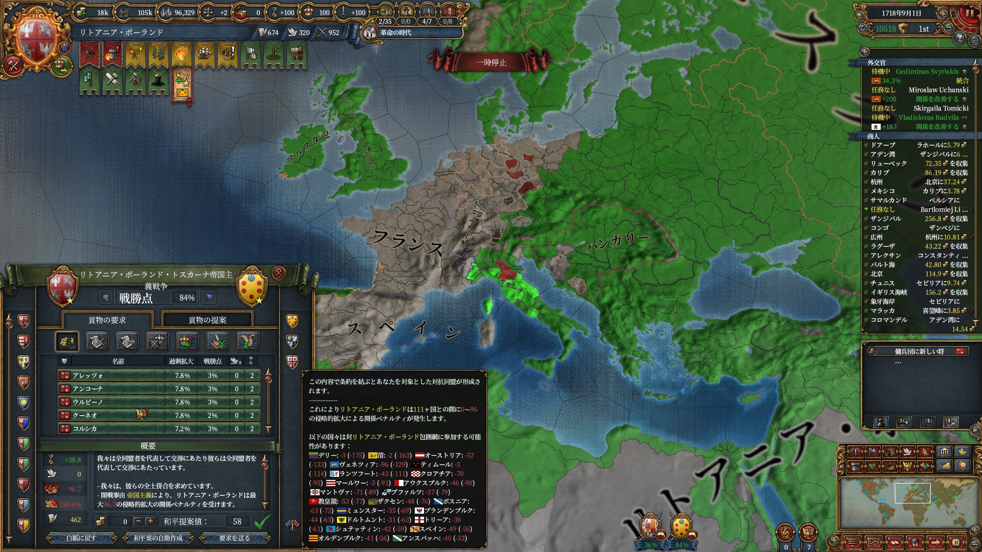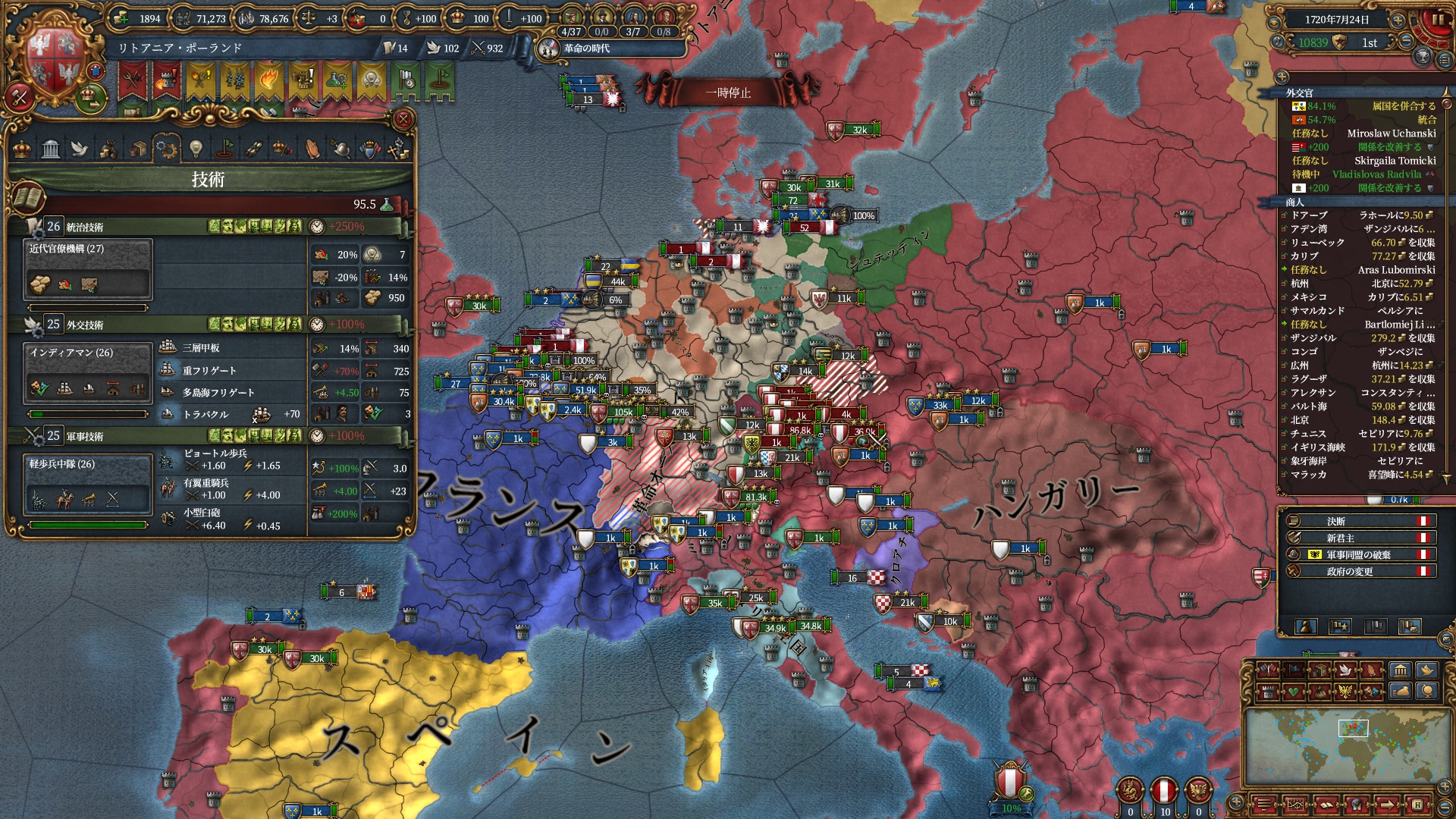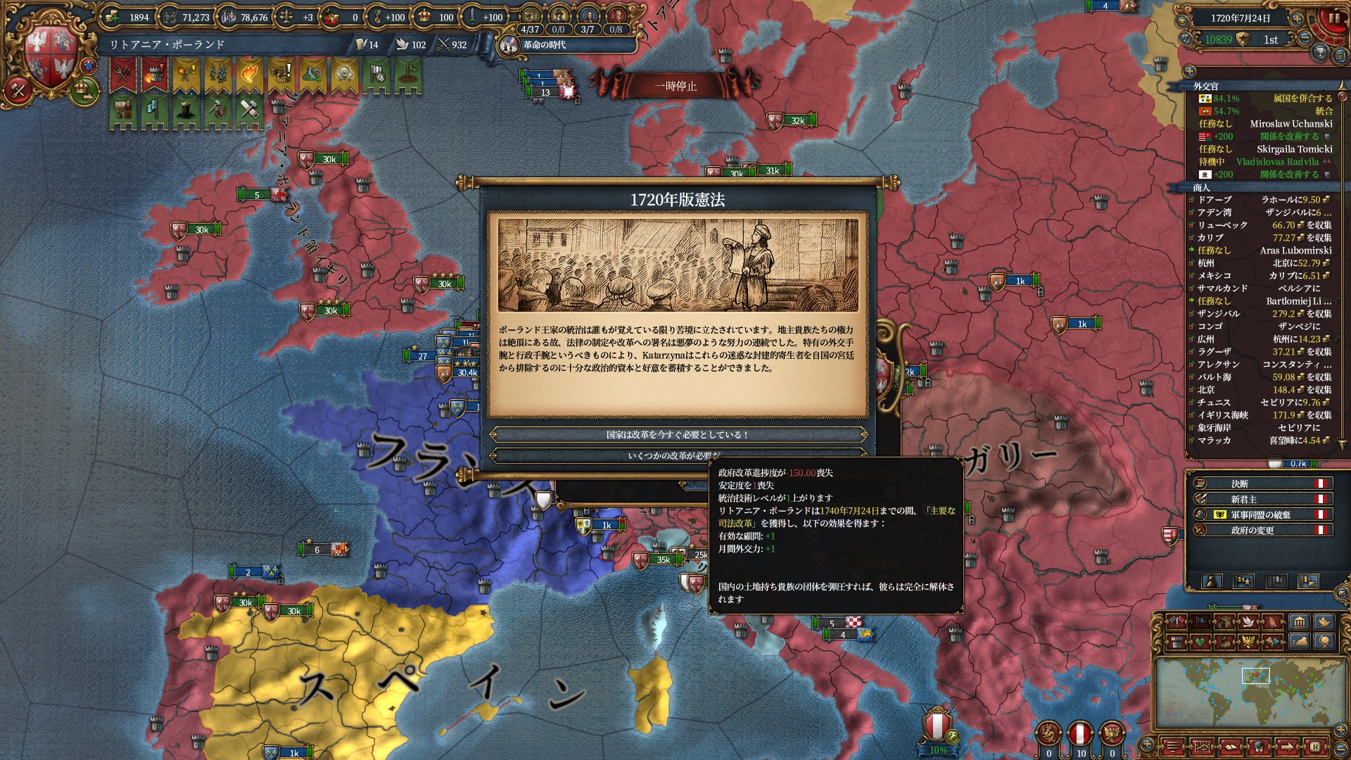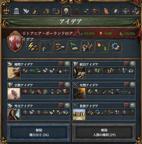 ゲーム後半はリトアニア=ポーランドNI・権勢アイデア・権勢統治ポリシーが合わさり属国併合コストは-60%に達します(特権込みで65%)。