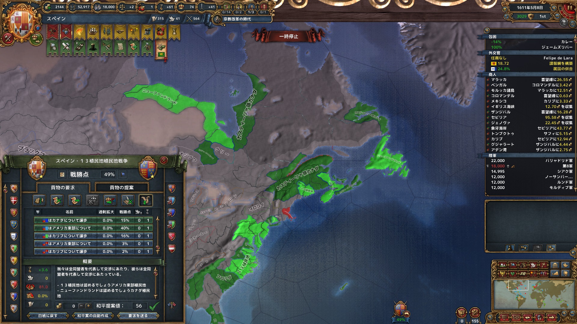 カナダと13植民地の権利をもらう。植民地について認める停戦条件は、ヨーロッパに比べて土地が取れすぎてヤバイ。