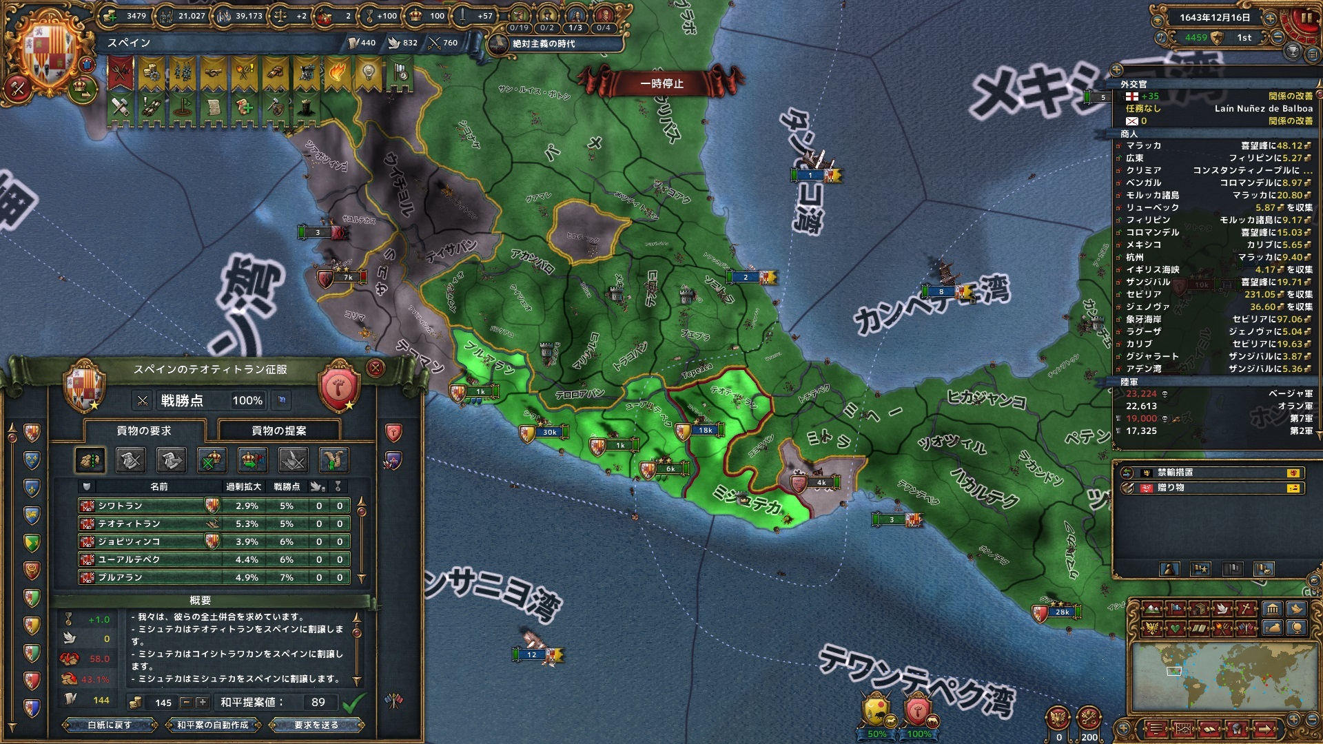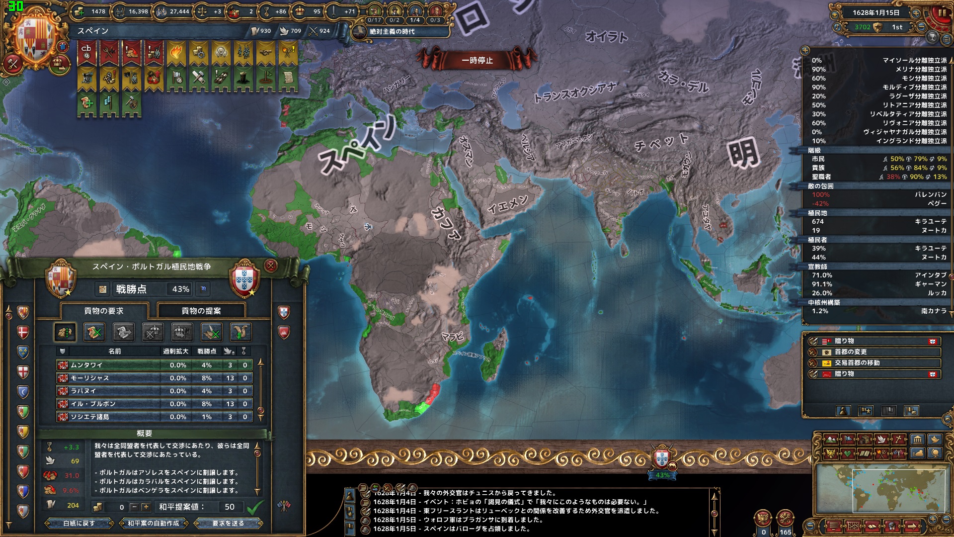 同月、ポルトガルとも停戦。セビリャまでの交易ルートの州をはじめ、海外州を中心に12州を獲得。