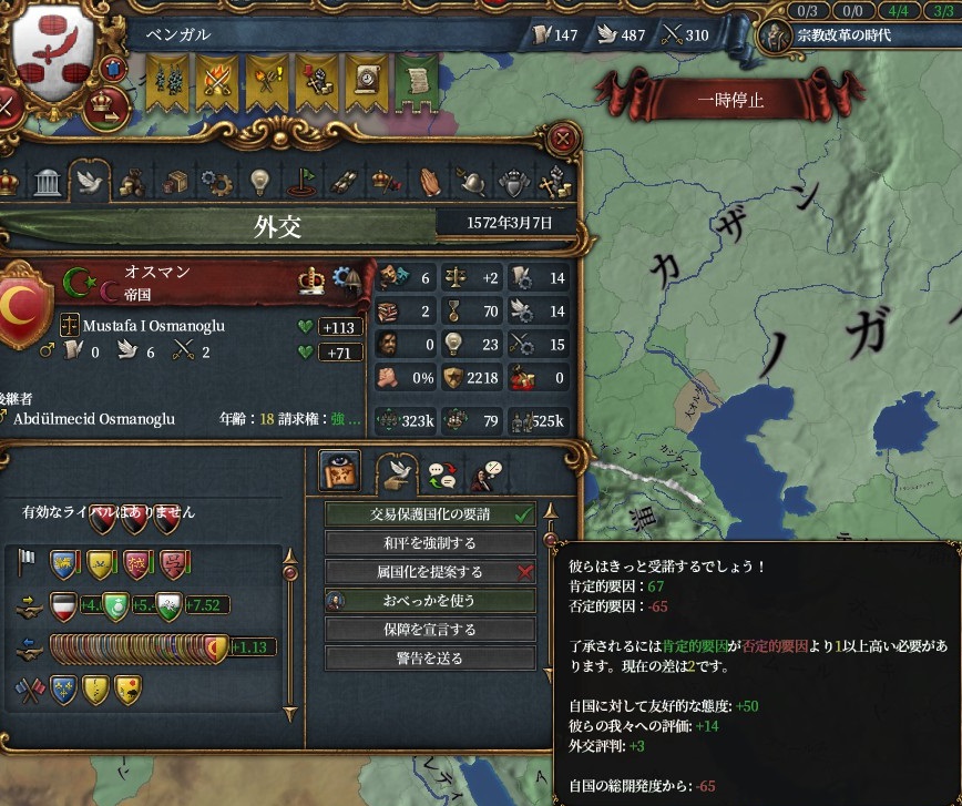 オスマンに対しての交易保護の要請が通るようになっていますので、AIベンガルはしばらくすると保護を要請するでしょう。