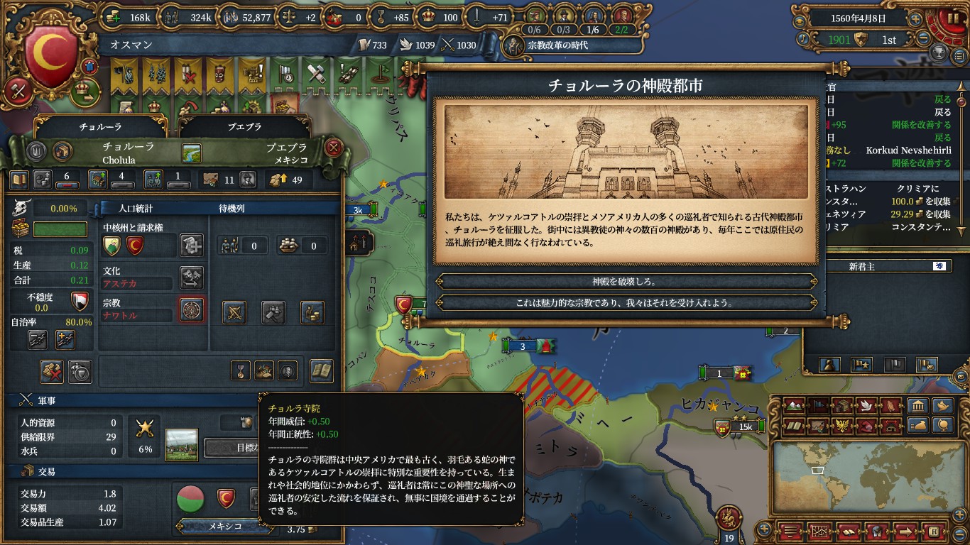 1のチョルーラ寺院のイベントはチョルーラ州をナワトル以外で領有し、州に「チョルーラ寺院」という補正がある場合に発生し、通常は破壊する選択肢しかありませんが、paganグループの場合に限りナワトルに改宗することができます。ただし破壊された場合は「チョルーラ寺院」の補正が失われるので二度と発生しません。