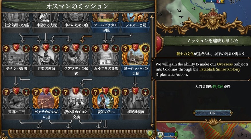 ディシジョン「Confirm Thalassocracy」に必要なノードのシェアを確保しやすく、ミッション Mansure the Armyか新旧オスマン政府以外でミッション Fate of the Devshirmeを達成するとtier5までを無償、ミッション Seize the Caliphateで神秘主義ルートに行った場合の最後のミッションでtier4までの改革を無償で貰えます。