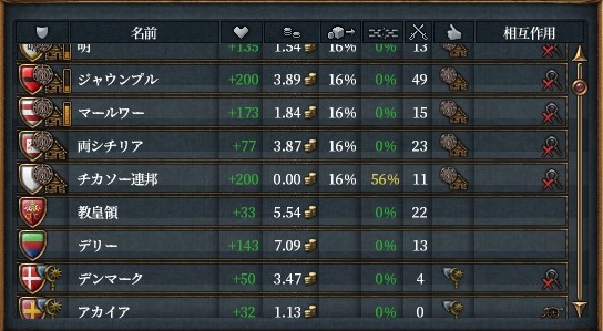 ai_acceptanceの判断基準(合計し+1以上ならaiは提案する) 受諾しない条件(-1000) ・保護受諾側の態度がライバル、敵対的、激怒である 受諾要素 ・保護受諾側の保護要請側への評価(評価×0.125、最大25、最小-25) ・保護受諾側の保護要請側への信頼((信頼-50)×0.4、最大20、最小-20) ・保護要請側の外交評判(外交評判(切り捨て)×3) ・保護受諾側の態度が友好的(+50) ・(保護受諾側の態度が支配的または保護的(+1000)) 否認要素 ・保護要請側の開発度(開発×-0.1) ・保護要請側の態度が中立(-20) ・国境距離