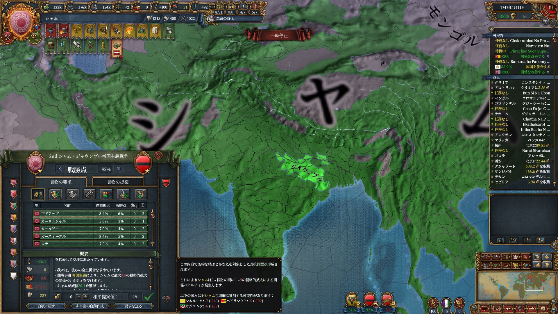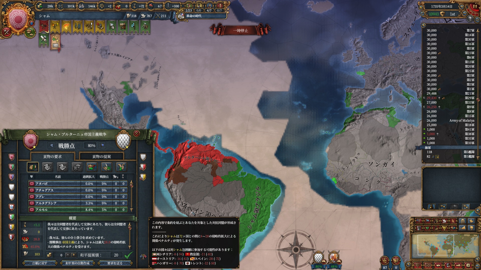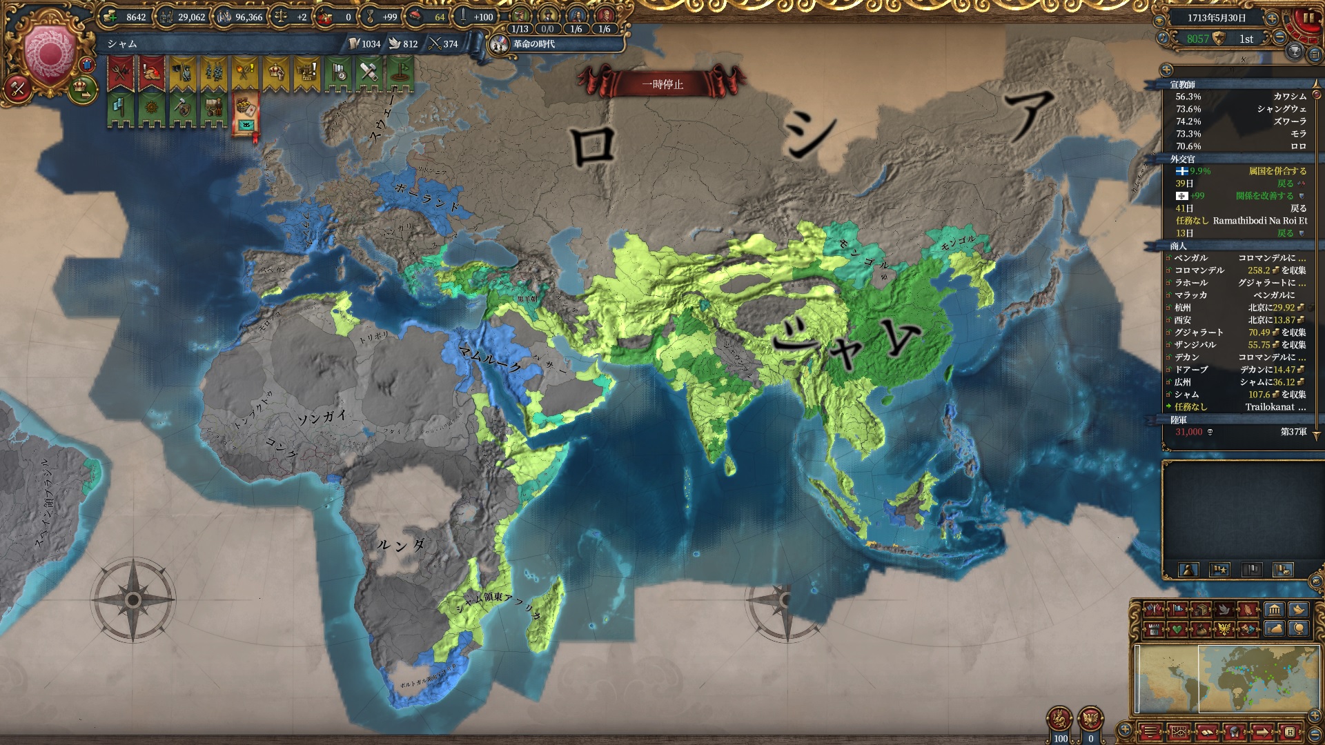 この一連の征服でフランス・スペイン・イギリス・ロシアが大きく弱体化したため、残り年数は少ないですが停戦破りをしないといけない程厳しいといった事は無さそうだと思います。