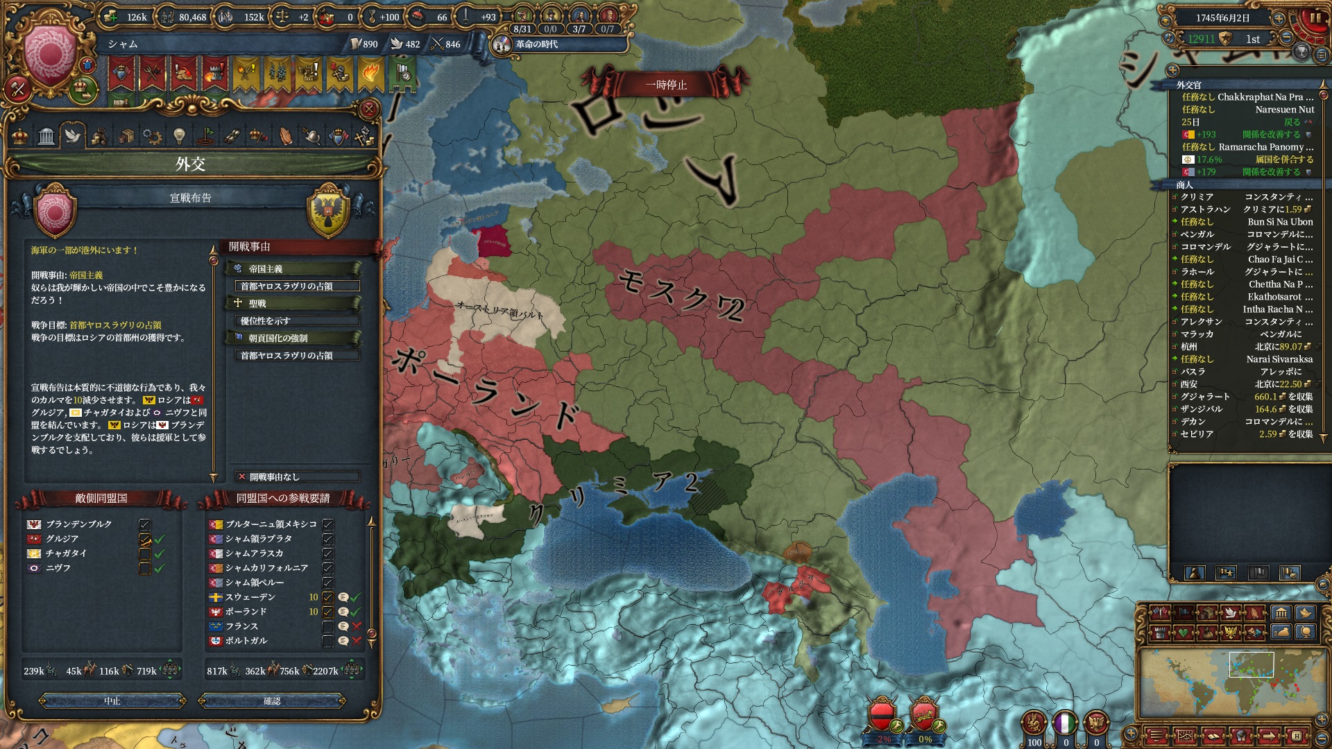 列強をしばいて回るのは勿論ですが、欧州側で衛星国が作れるエリアがあまり無いのでなるべく衛星国ラインを延ばせるように侵略したいところです。