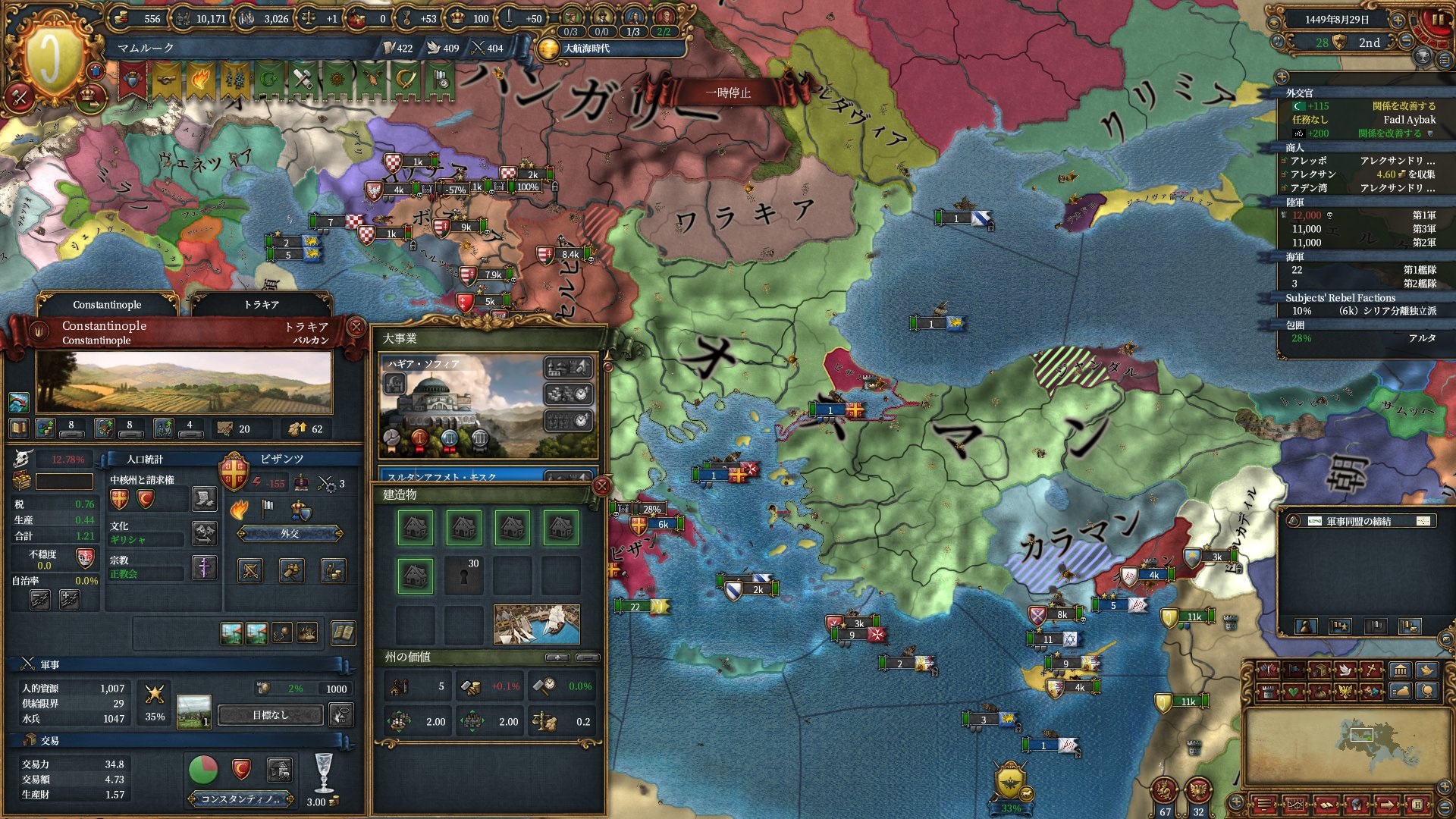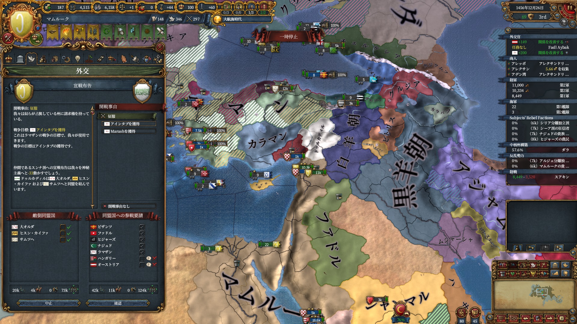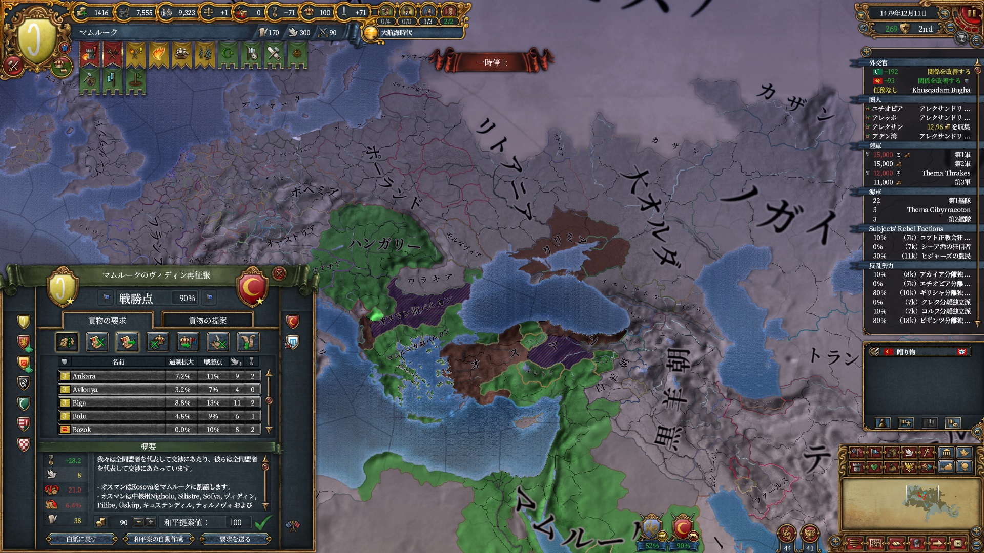ブルガリアを属国解放しオスマン戦です。エレトナも既にいるため再征服対象は非常に豊富です。