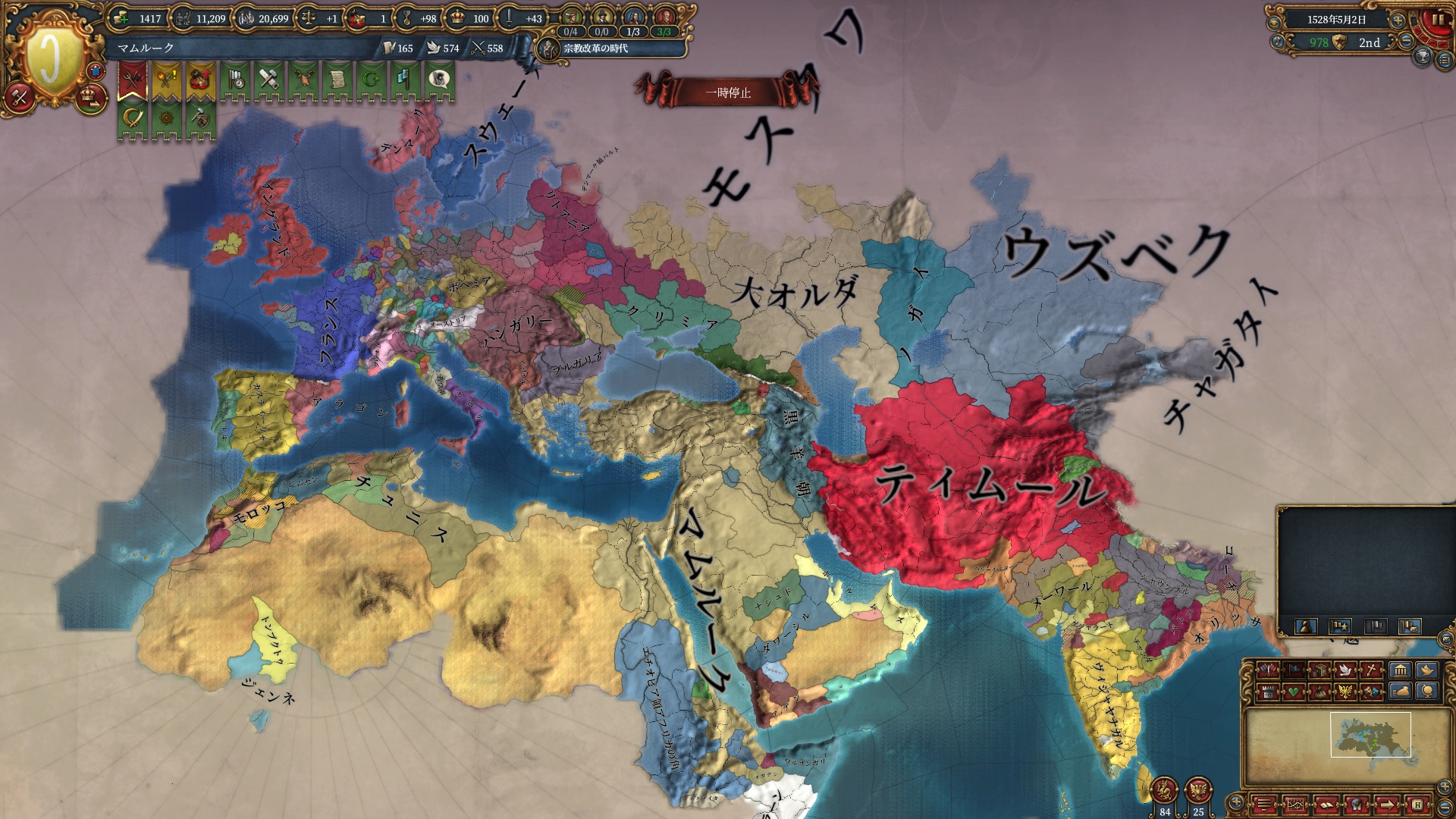 一応ティムールはまだインド側にそれなりの国力を持つ土地が残っていますがデリー(元ジャウンプル)のコアが大量に埋まっている場所でもあり、このあと向こうでは一悶着あったようでまともな会戦としてはこれが最後になります。