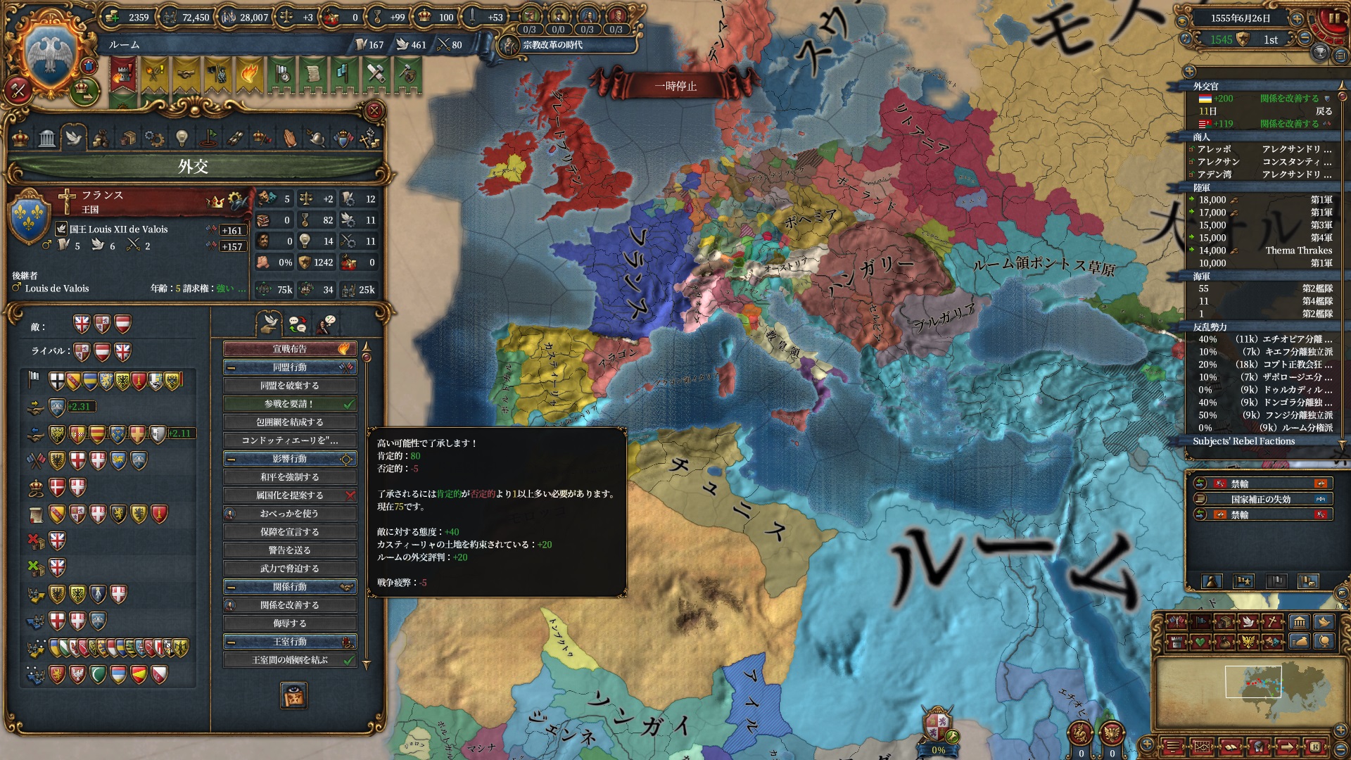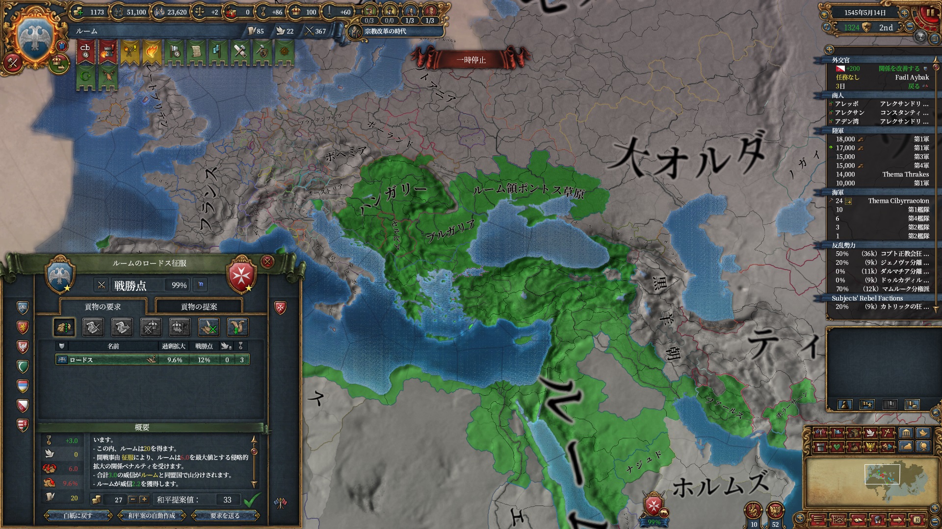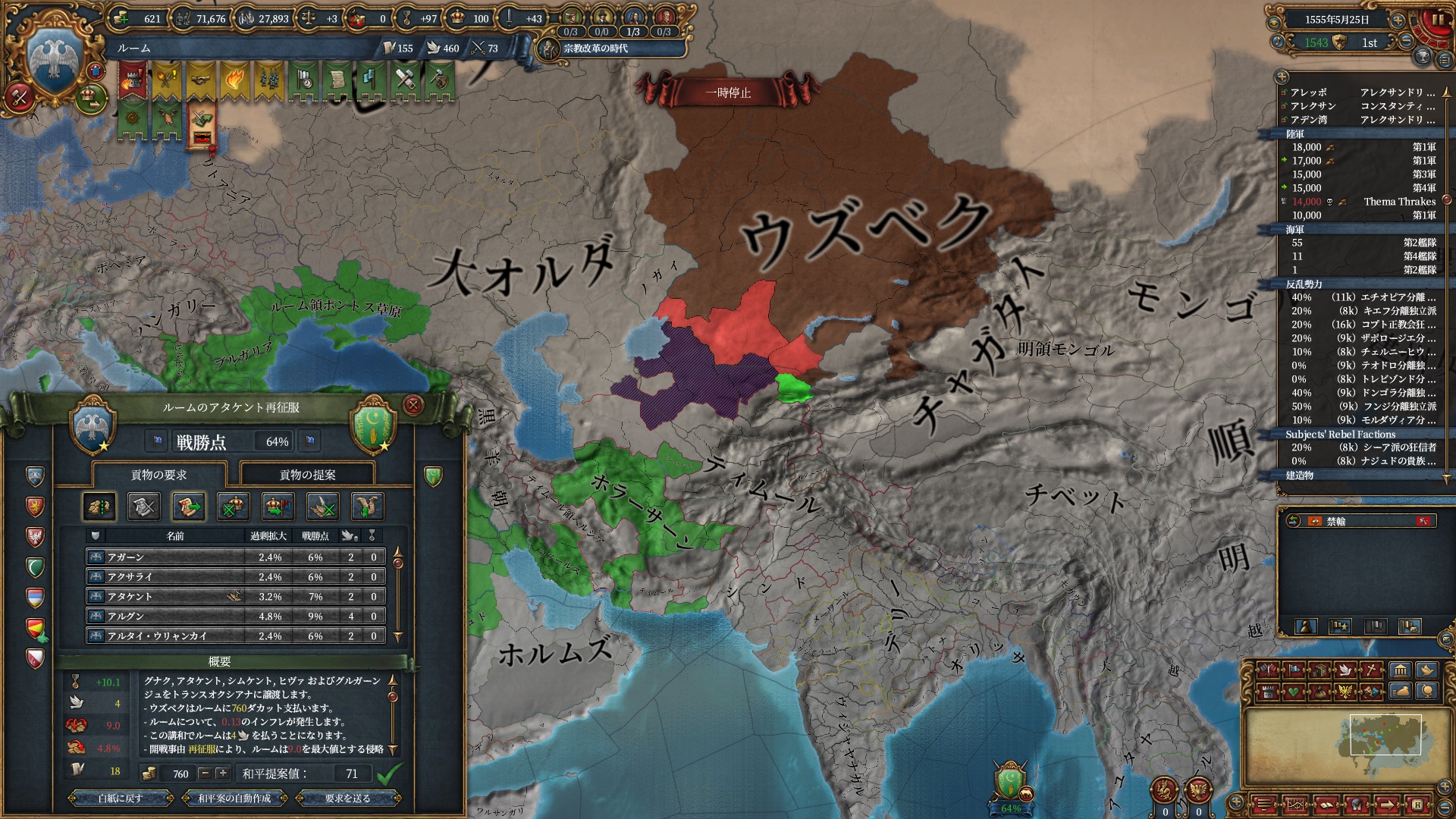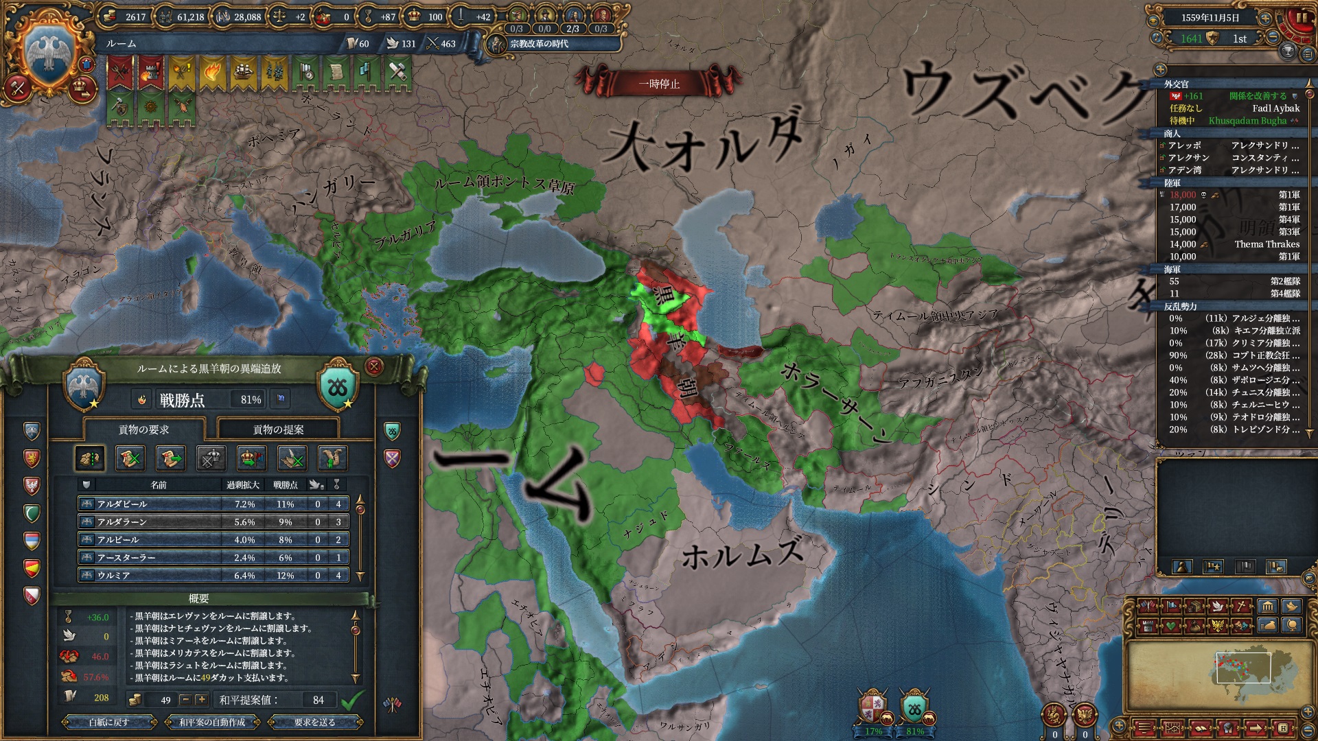 ほか、同盟国を引き連れ宣戦した時にわざわざこちらに解放しに来てくれそのまま反乱軍撃破したり、属国領に反乱軍が突っ込んで返り討ちにあったり(インド聖戦用の突端に行こうとしていた?)グダグダな事に。。