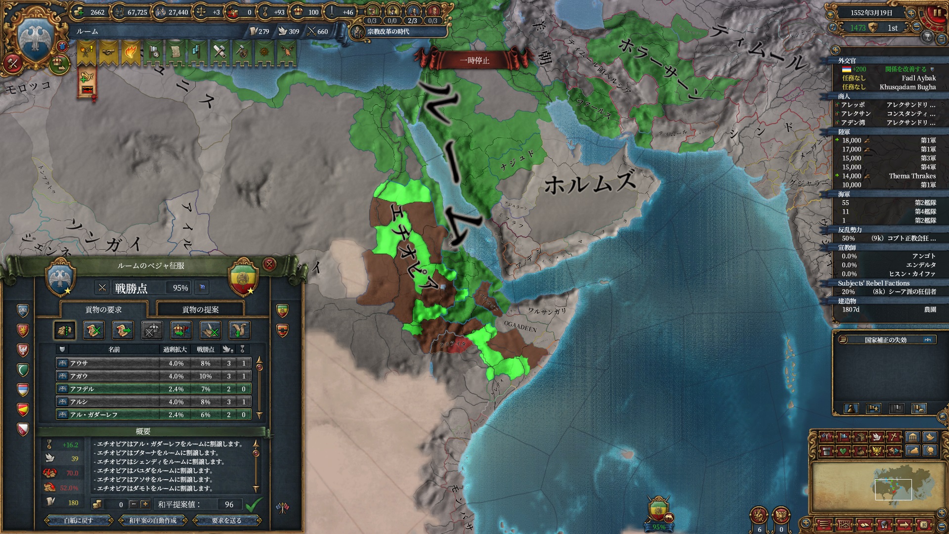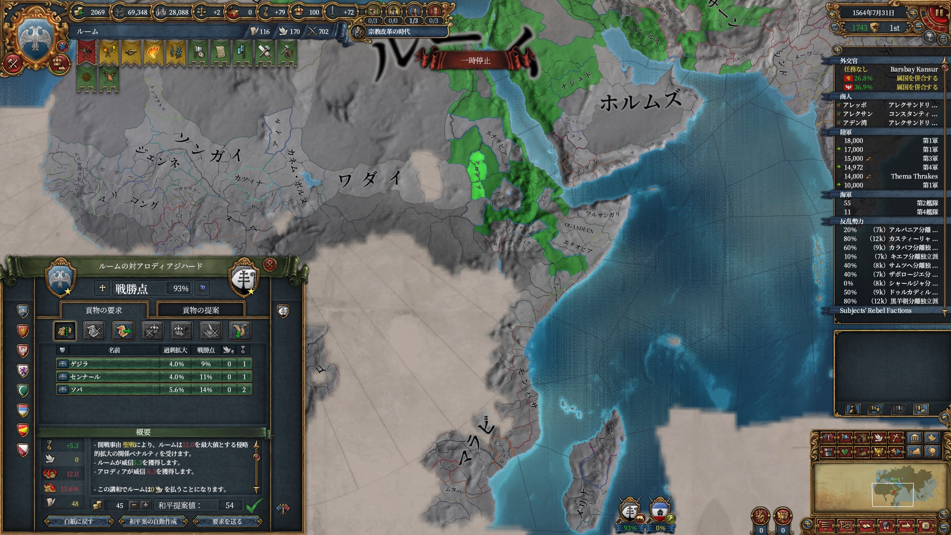 この後しばしば反乱軍を出現させているのですが、エチオピア→カイロ→イラク方面のルートしか反乱改宗してくれず大分時間がかかってしまっていました。