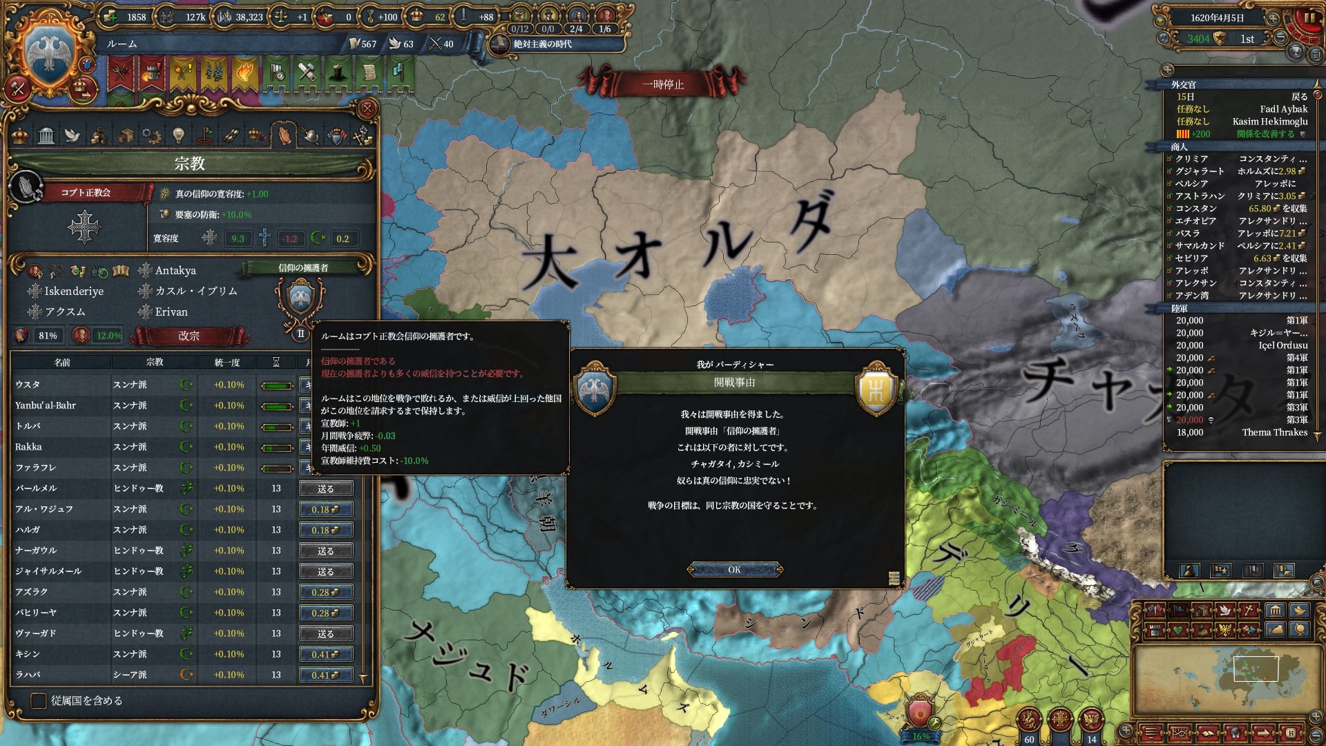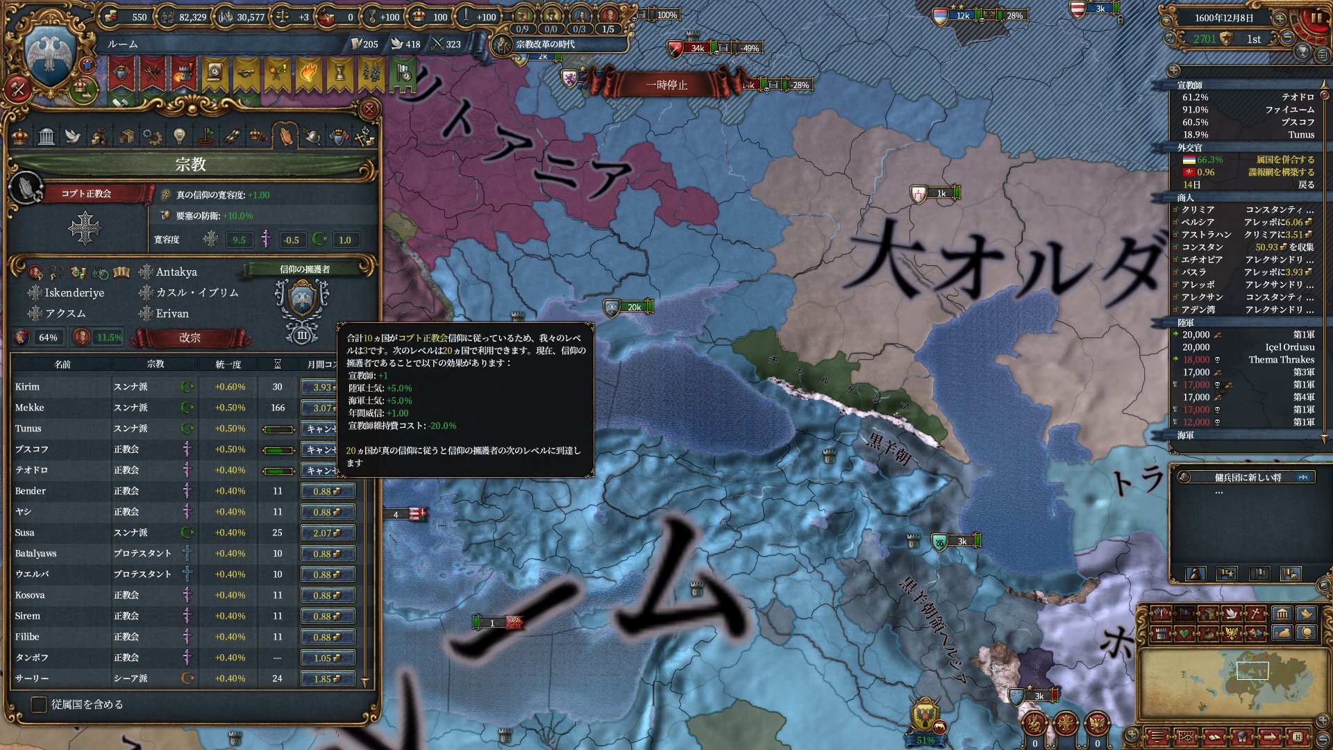 1→5→10→20→50と国数が増える度にDoFのLVが上がるこのシステムですが、10~20国のDoFLV3というのはマイナー宗教だと本国+植民地国家12種で一番なりやすい状態というのも中々な感じです。