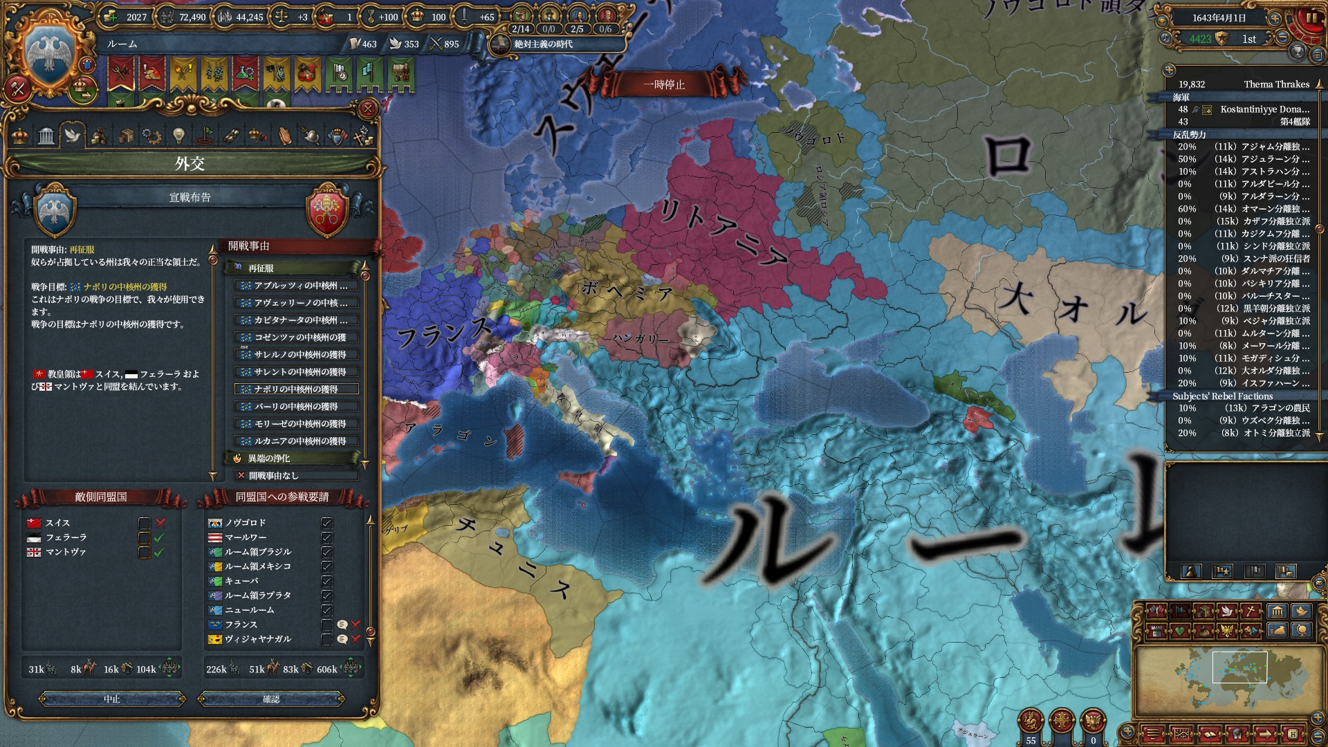 フランスら開発度が高いキリスト教国家は後継者ねじ込み同君で速やかに始末しても良いかもしれませんが忘れていました。