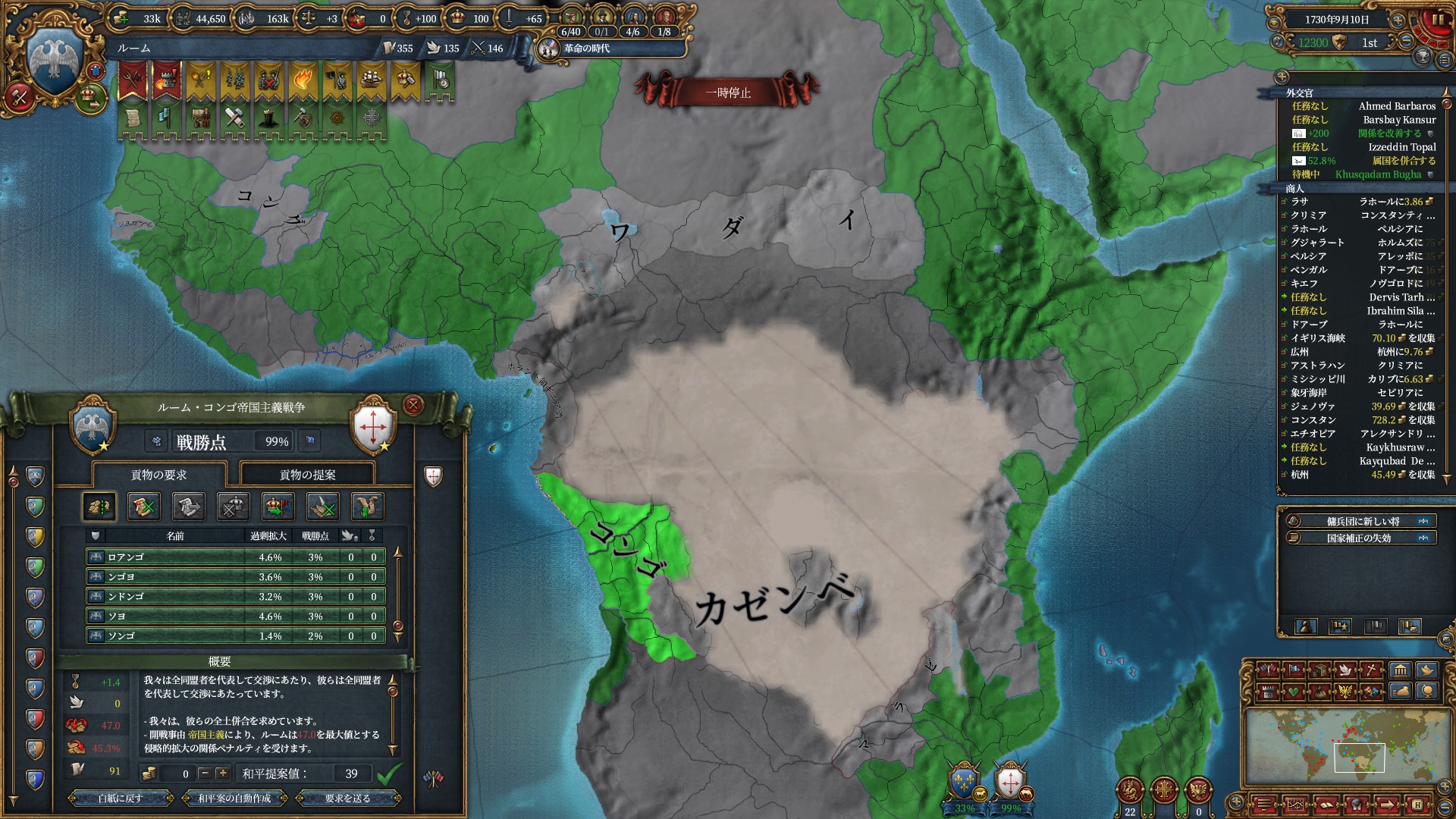 並行して進めていたコンゴ戦ですが、ここら一帯を手に入れたことでカゼンベへのアクセスが楽になりました。
