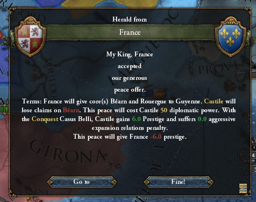 ふむ、BéarnとRouergueをギュイエンヌに返還で講和ですか。