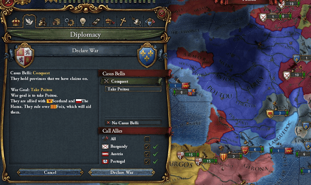 次の戦争でブルターニュのコアを返還させるわよ。同時にギュイエンヌに外交併合を開始して。