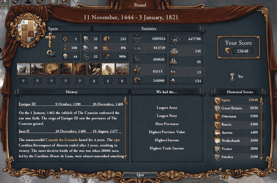 ふむ。やはり、スペイン成立までDIPにかかったペナルティーとポルトガルの併合ptが大きな負担になったということですね。