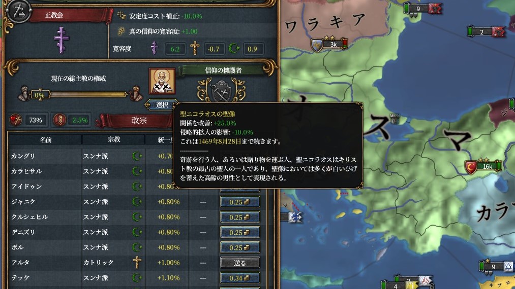 改宗したら主教座を二つ配置し(都合いいことにちょうど二つ配置できます!)、ニコラウスを発動します。