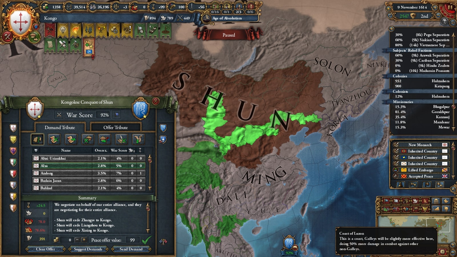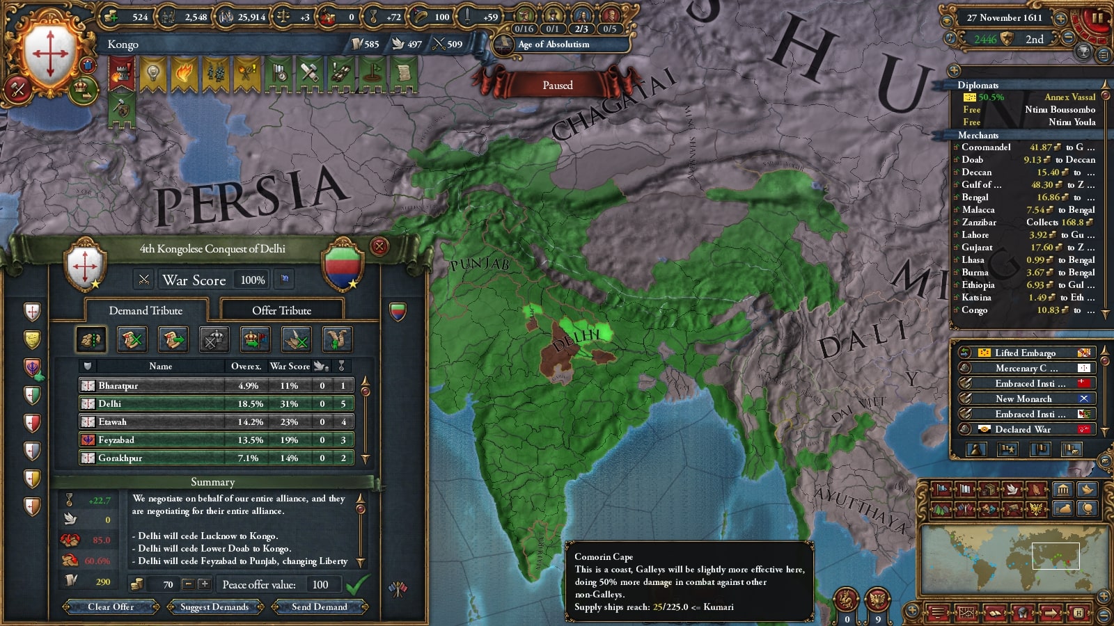 AEが慢性的にたまってきているので同盟国に負け講和して西アフリカのクソデカ朝貢国を開放しています。
