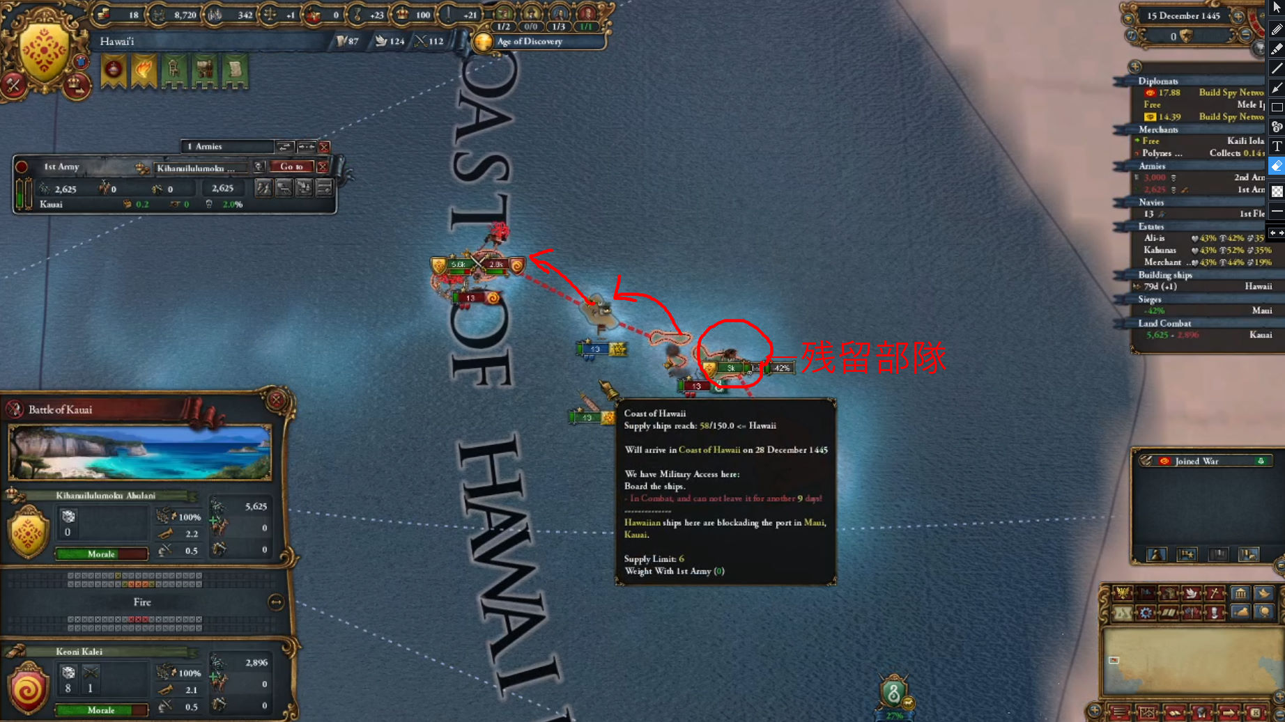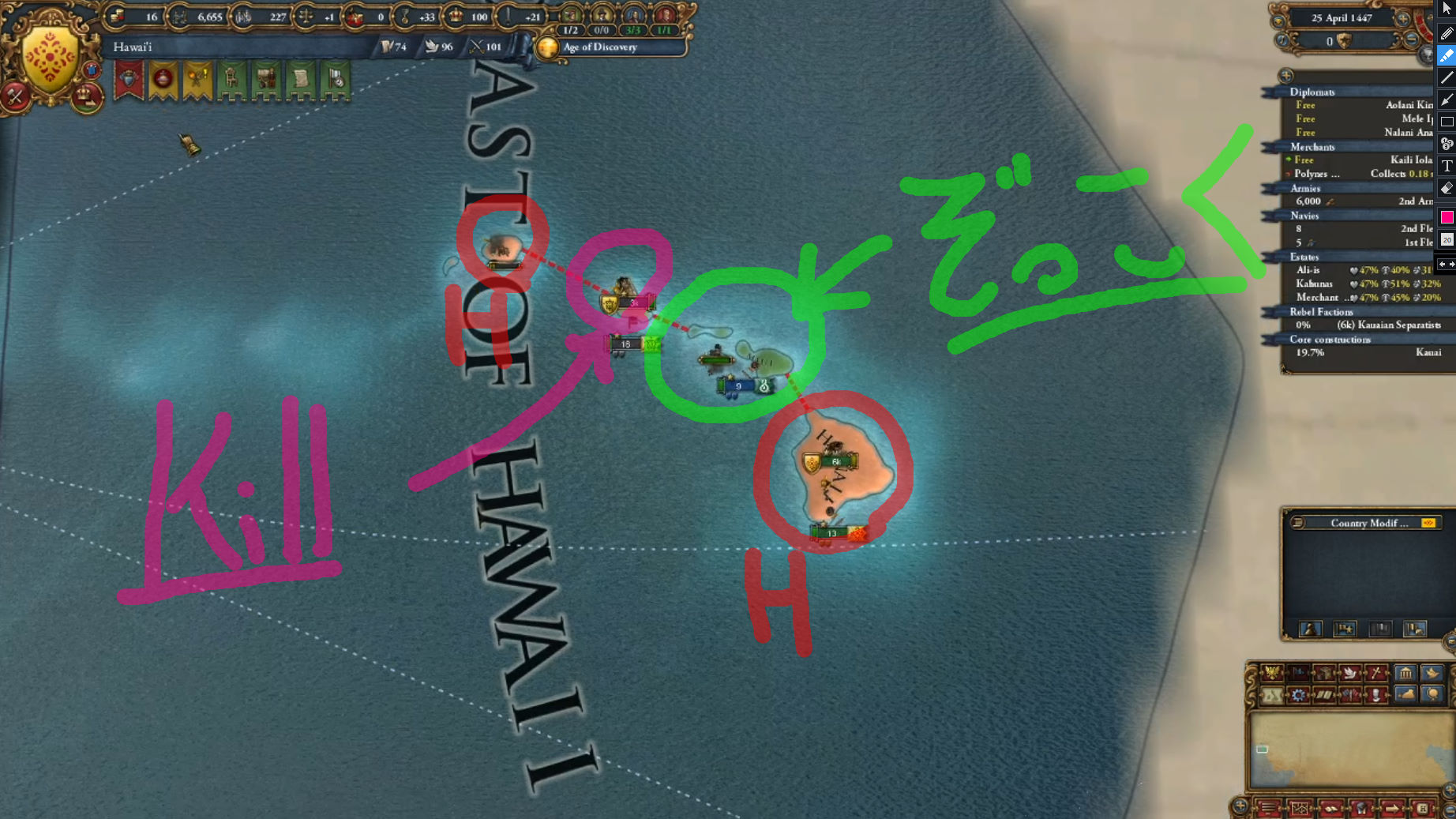あとは包囲して終了、カウアイは併合したけど手早く船が欲しいのでマウイは属国にした。オアフが何か言いたげにこちらを見ていたので空気を読んで同盟を切った。今日もまた一つ徳を積んだ気がする。