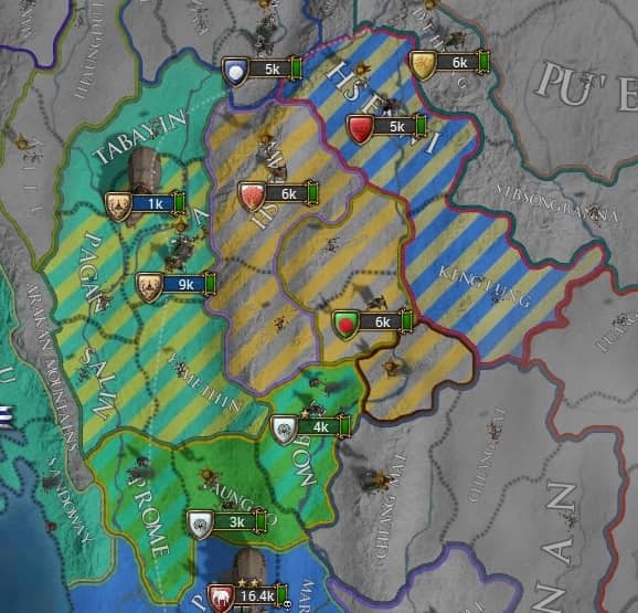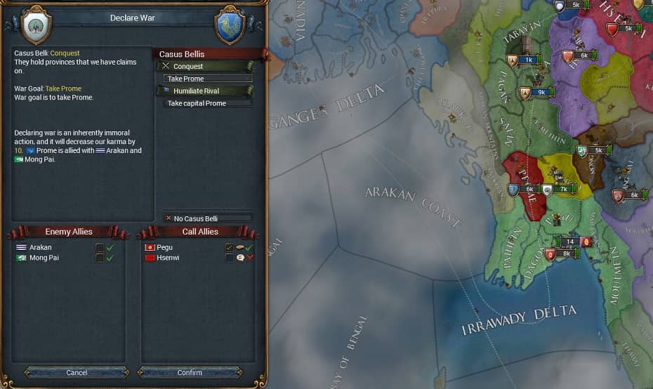 南のPeguと同盟を結んで領土を約束(上げるとは言ってない)して宣戦布告します。