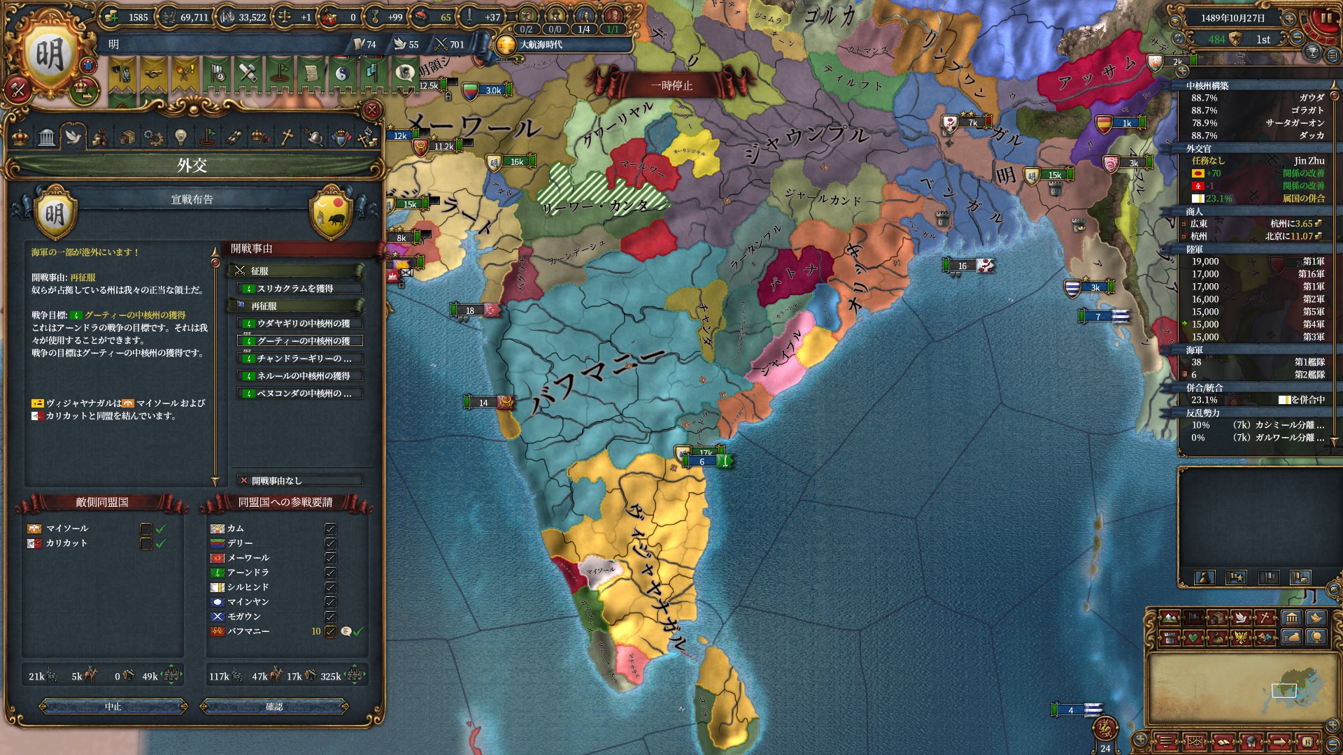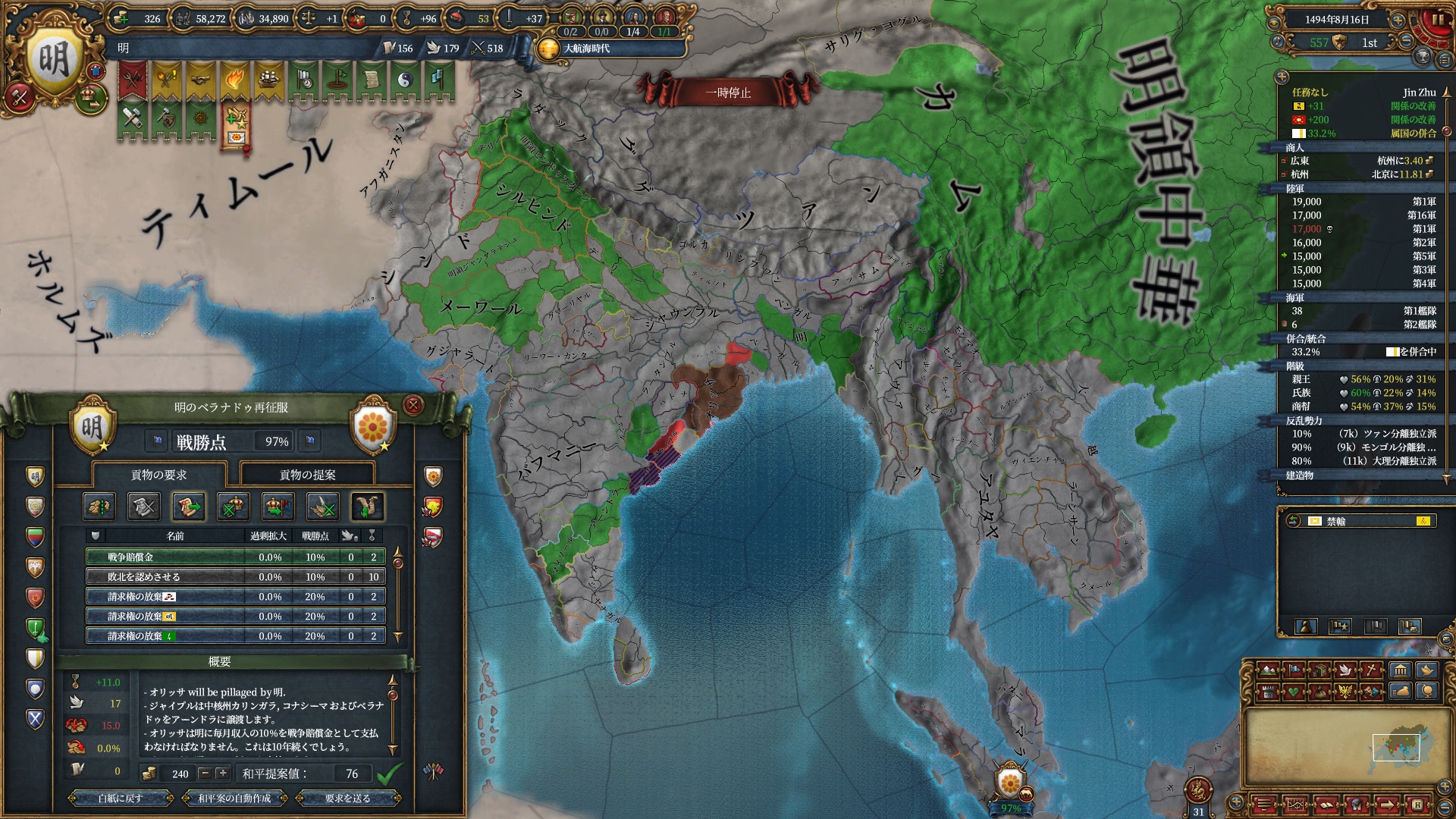 序盤は明も人的資源が大した数が無く人的資源が必要なのと、朝貢国の戦争を抑えるのを副次的目的として狙っています。