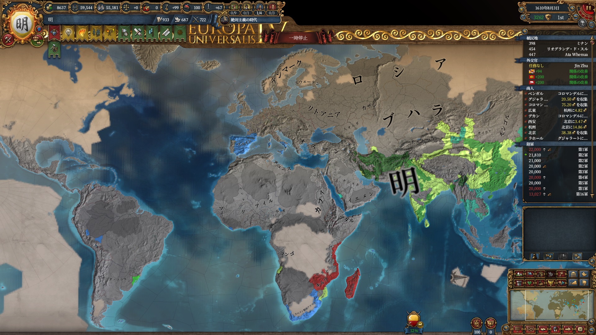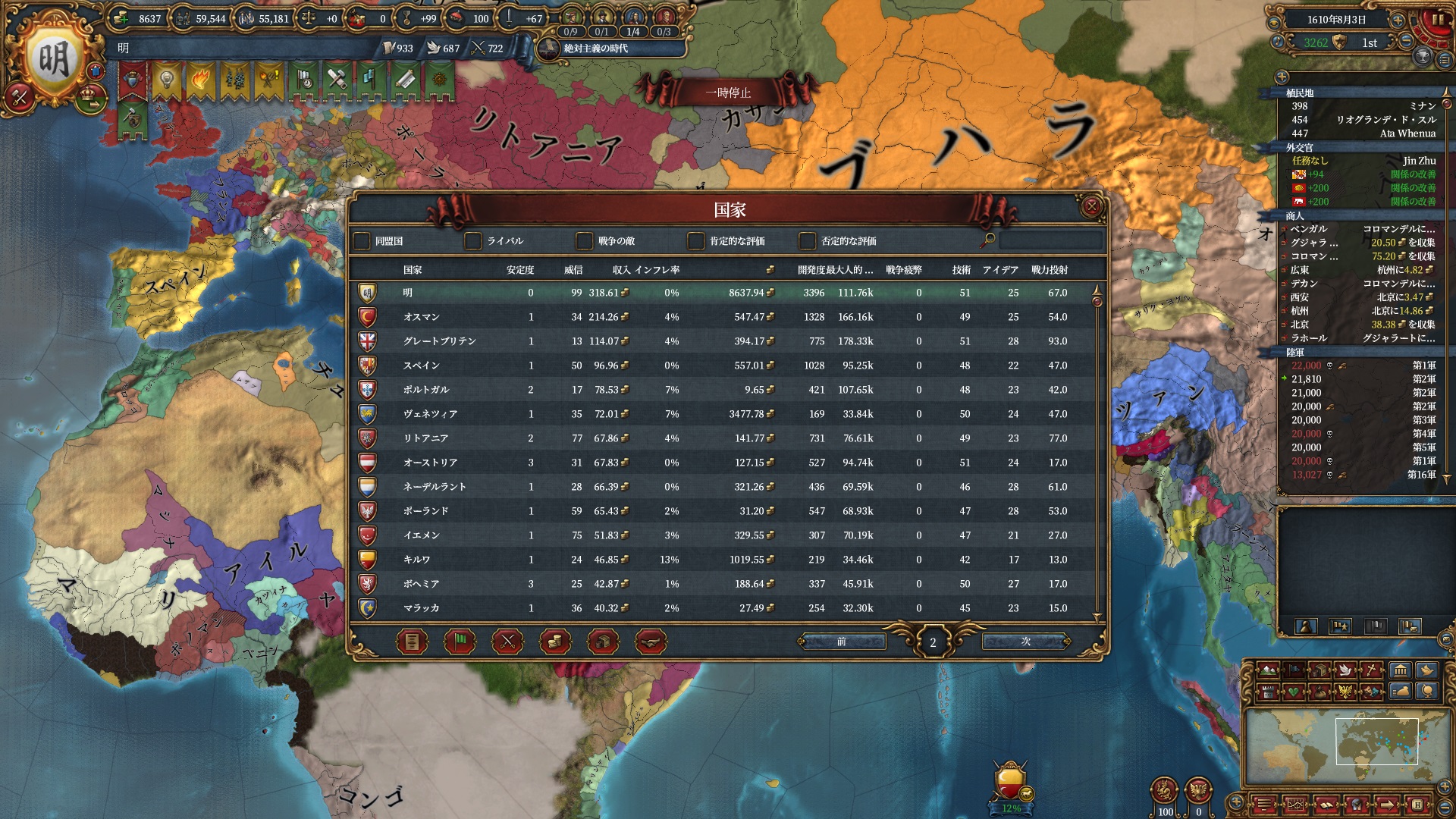 軍量を取り優秀な交易ノードを持つオスマン、イギリスが現時点では内政力・軍事力どちらも飛びぬけています。この2国は拡張し切る前に何発かぶん殴っておかないと間に合わなくなりそうです。
