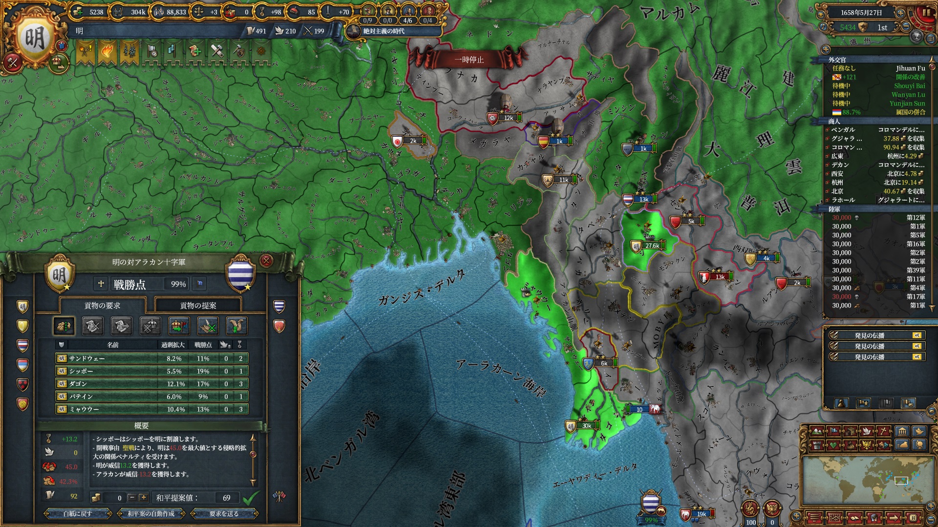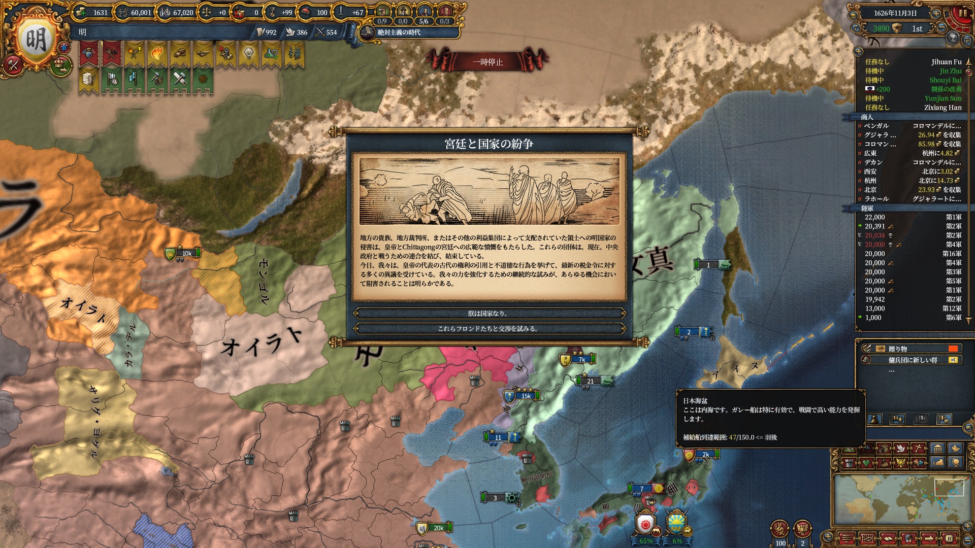 プレイヤーだけでなくAIも同盟国剥がしに向かう事が多いです。南側は明とかなり遠いスペインに対し北は隣接しているポーランド・リトアニア。彼らの領土が吹き飛んでいる間に南を掘り進めましょう。