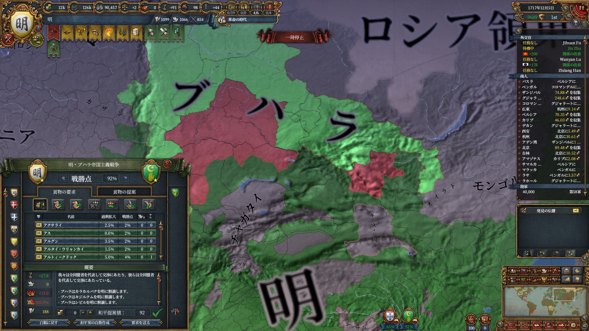 全州取得に必要な戦勝点は100を超えていますが帝国主義CBで75%の領地割譲と組み合わせれば(AEは無視するとして)属国に出来そうです。