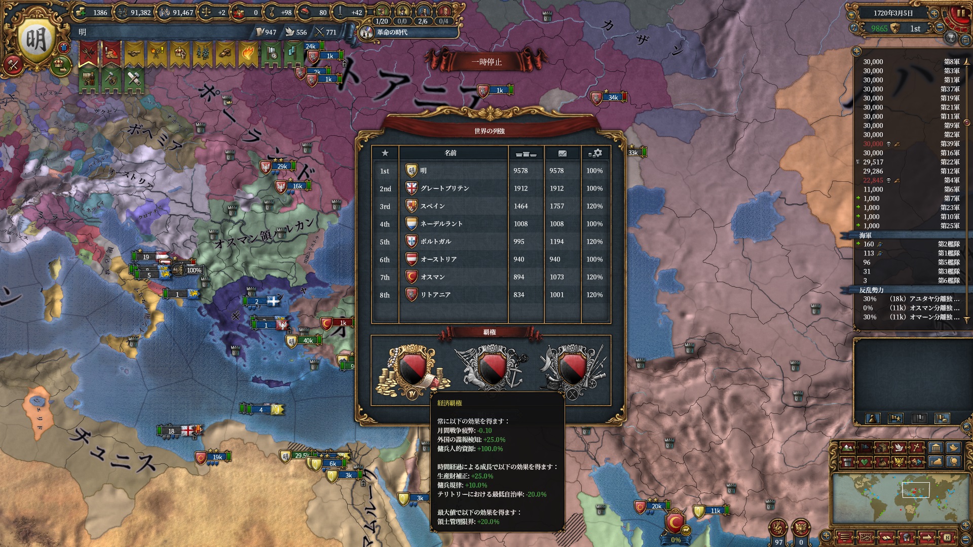 同盟国達はTrustが100に張り付いているのもあって為暫くは同盟のままでいてくれますが、そのうちAEのマイナスでopinionが+を維持できなくなり同盟強勢破棄となる為いけるところまで使い倒します。