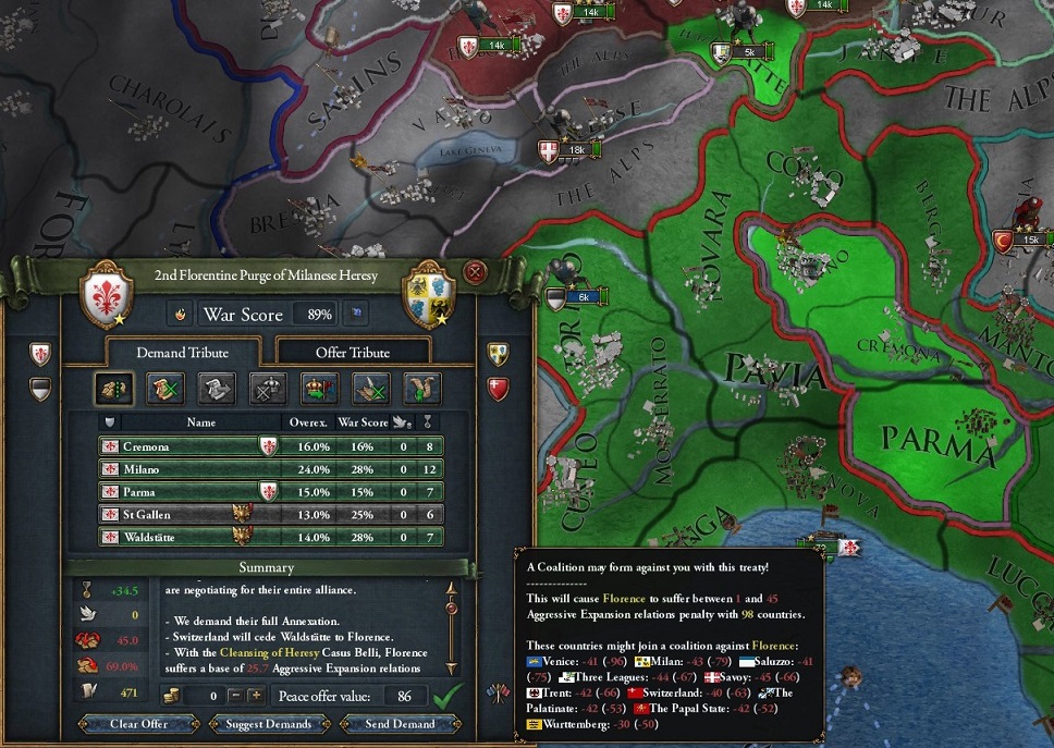 さらにVeniceとも終戦し,イタリア領と同盟国のSaluzzoを併合する.SaluzzoはSavoy・Genoa・Provenceに囲まれた場所の1プロビ国家.