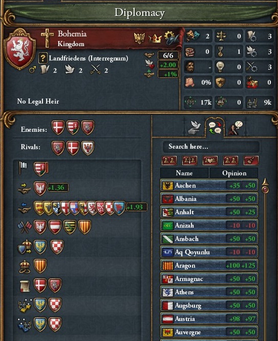 外交に関しては、アラゴンと婚姻同盟、オーストリア・ポーランド・ザクセンとは同盟のみを結びました。ライバルにはデンマーク、ブランデンブルク、リトアニアを設定しました。