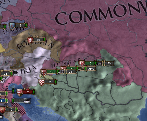 ハンガリーは初期からライバル視するオーストリアに対抗するため同じくオーストリアをライバル視するフランスと同盟を結んでいたのですが、コモンウェルス・オーストリア連合軍に敗北する度に領土を削り取られていました。